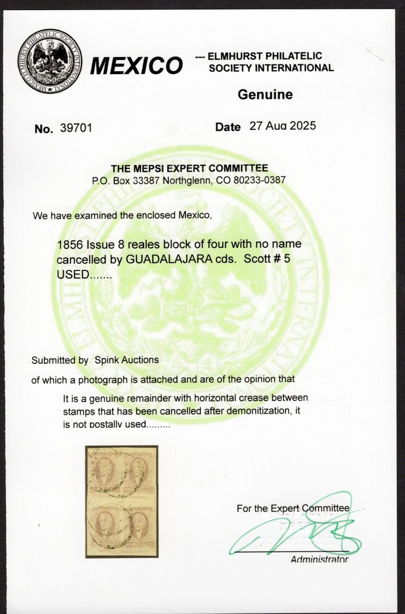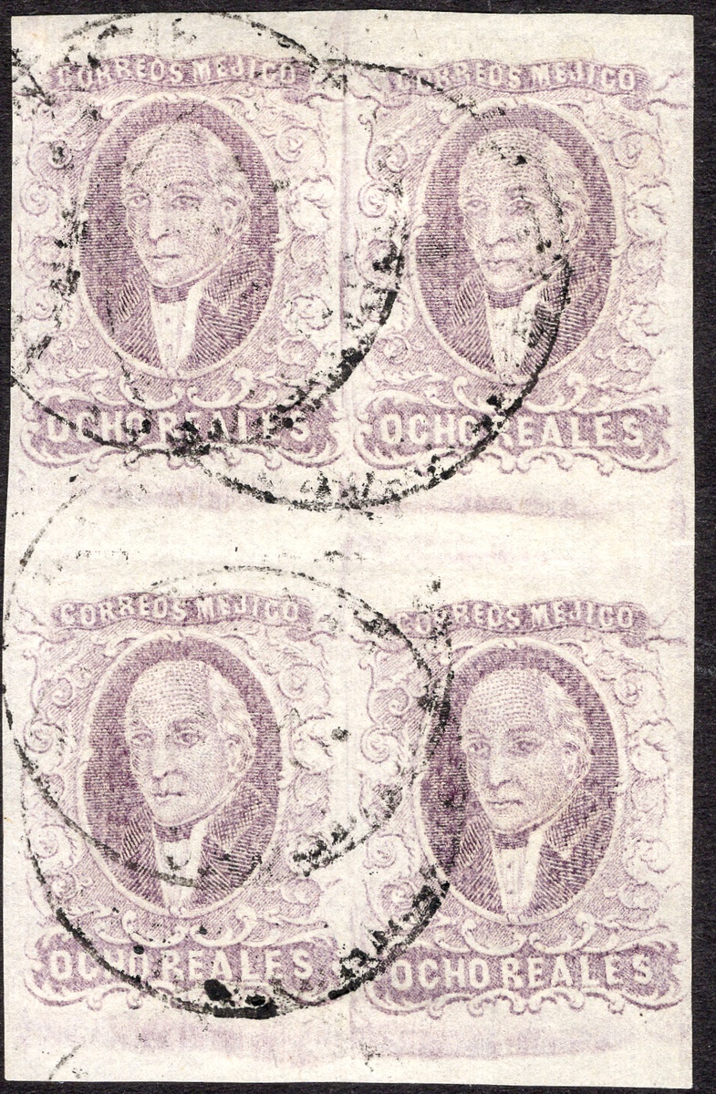 Guadalajara 8r. Lilac, no overprint, a spectacular block of four boasting good margins. The cancel was applied to remainders from this district. 2025 MEPSI certificate. Scott 5; NF $600 as used singles.,