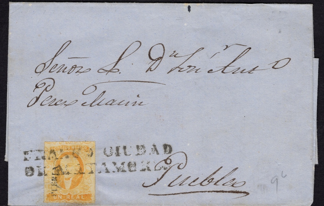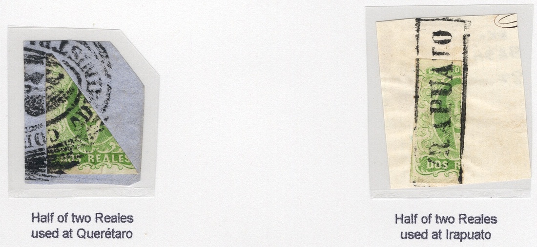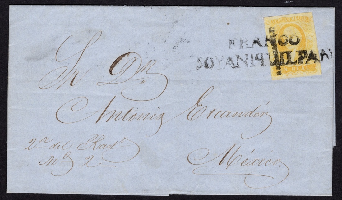 Guanajuato, Puebla, Querétaro, Soyaniquilpam Group comprising two attractive single 1r. Yellow covers and two bisects of 2r. Green on piece. The covers include Matamoros (Puebla) to Puebla dated September 9, 1858, two good margins, showing an excellent complete and scarce cancellation tied to the cover; the other 1r. Yellow single with good margins all around, used from Soyaniquilpam to Mexico (22.9.1858), featuring only 820 issued in this small district (NF $200 for an off-cover single). As well as two 2r. Green bisects on piece with fantastic strikes of h.s. from Querétaro and Irapuato. Scott 2, 3c.,