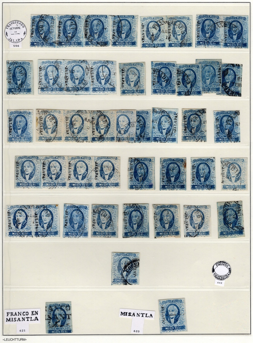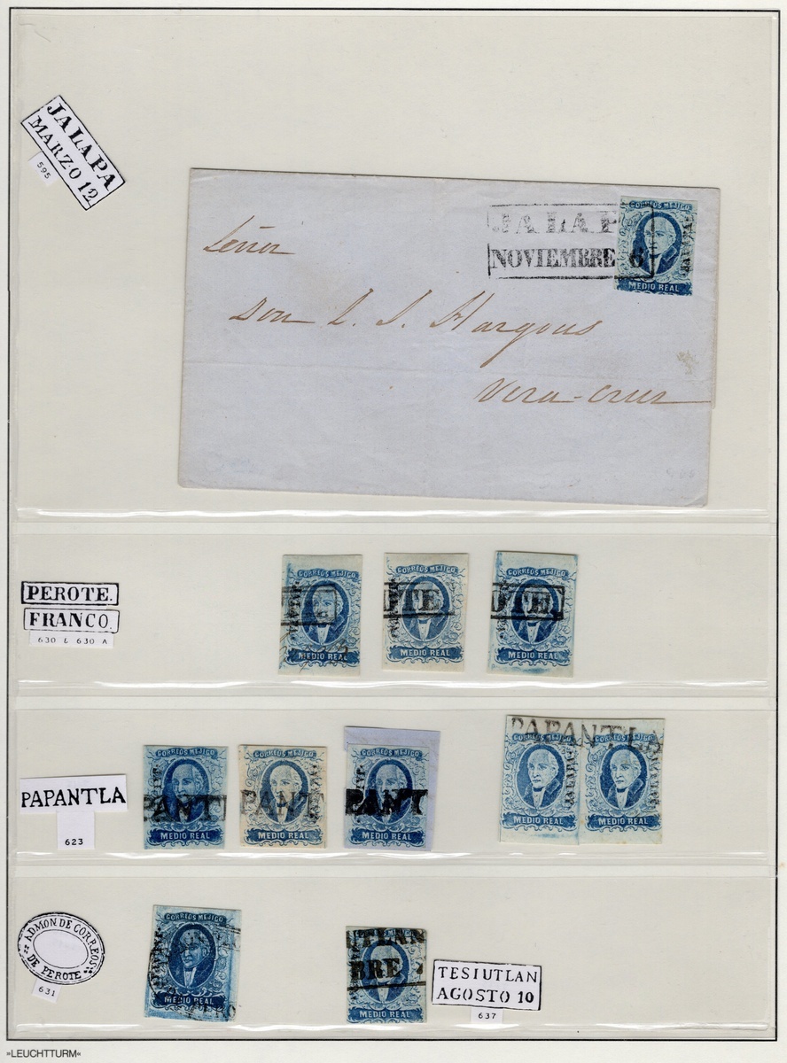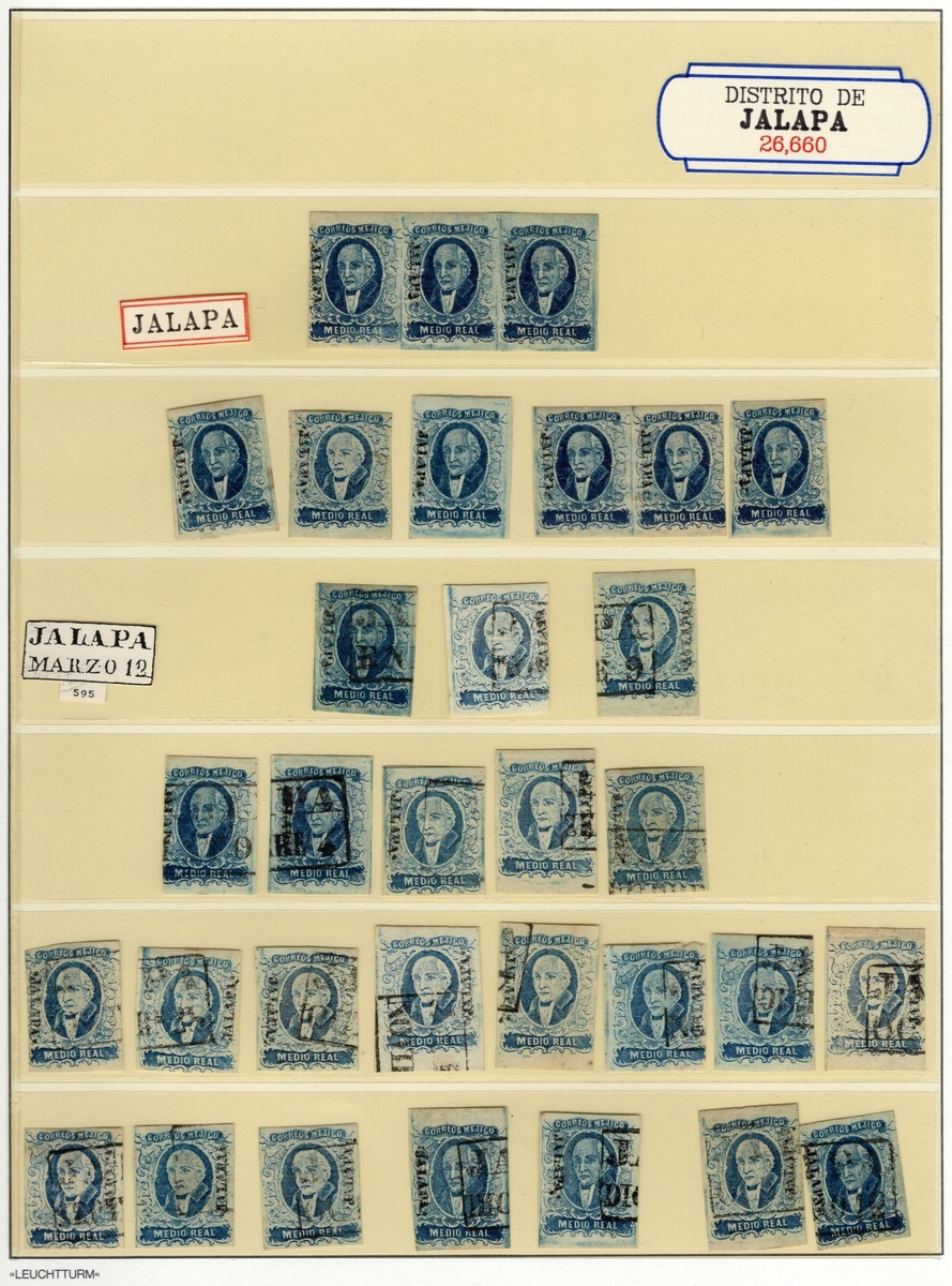 Jalapa ½r. Blue, assembly of 87 stamps (nine unused), including usages from Jalapa, Perote, Papantla, Teziutlán, Misantla, and Zacapoaxtla, plus a very clean 1856 cover to Veracruz bearing the first-rate franking. Overall in good condition, with many examples showing three or four margins. Scott 1; NF$3,570.,,