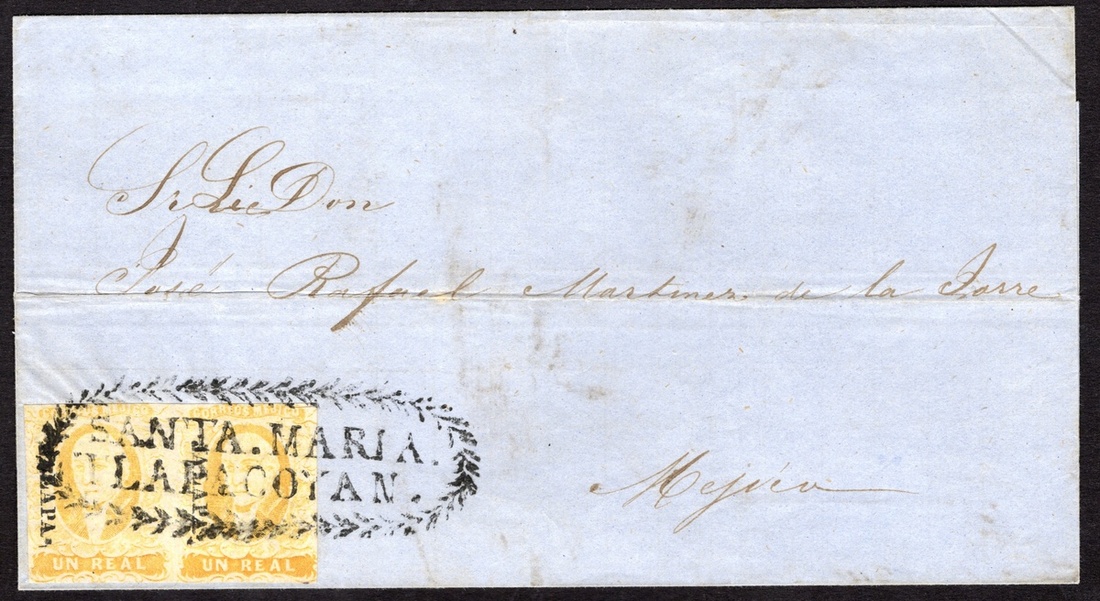Jalapa 1r. Yellow pair, small margins or cut into, on cover dated November 4, 1857 to Mexico City, tied by an outstanding strike of the extraordinary Santa María Tlapacoyan wreath h.s., originating from this very small town. A spectacular exhibition item. Scott 2.