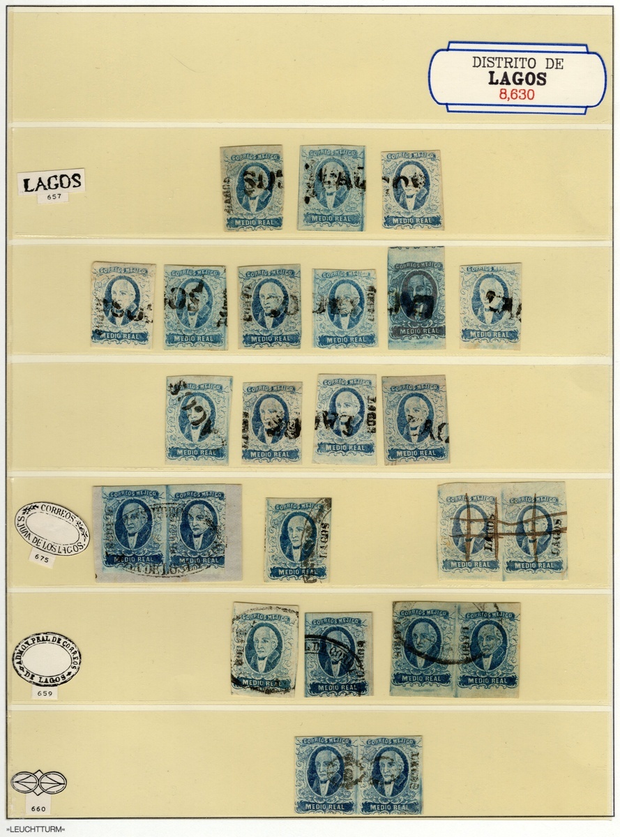 Lagos ½r. Blue, group of 24 used stamps (some unoverprinted) with cancellations from Lagos and San Juan de Lagos. Overall in good condition, with many examples showing three or four margins. Scott 1, 1b; NF$960.