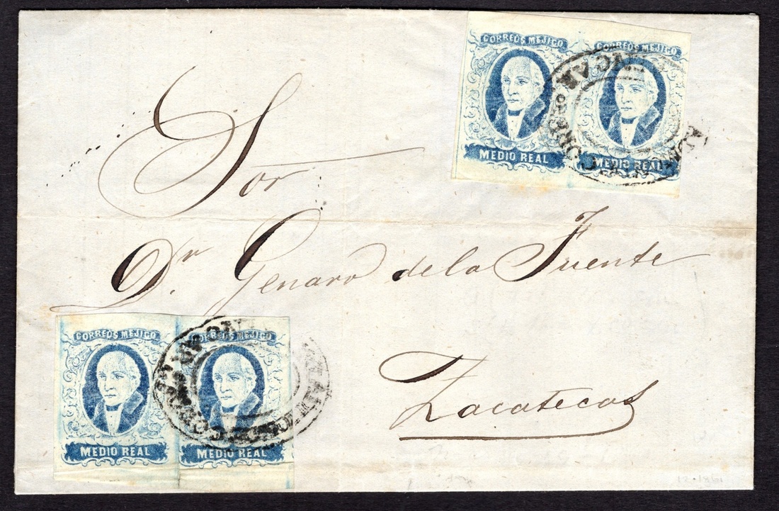 Lagos, Maravatío Group of two covers from very small and scarce towns: ½r. Blue, two pairs on entire letter from Encarnación (Lagos) to Zacatecas dated March 19, 1861, good margins -just one close at right-; and unoverprinted 1r. Yellow on cover from Zinapécuaro to Morelia, tight margins at top and right, but with two different h.s., both well struck. A rare duo. Scott 1, 2c.