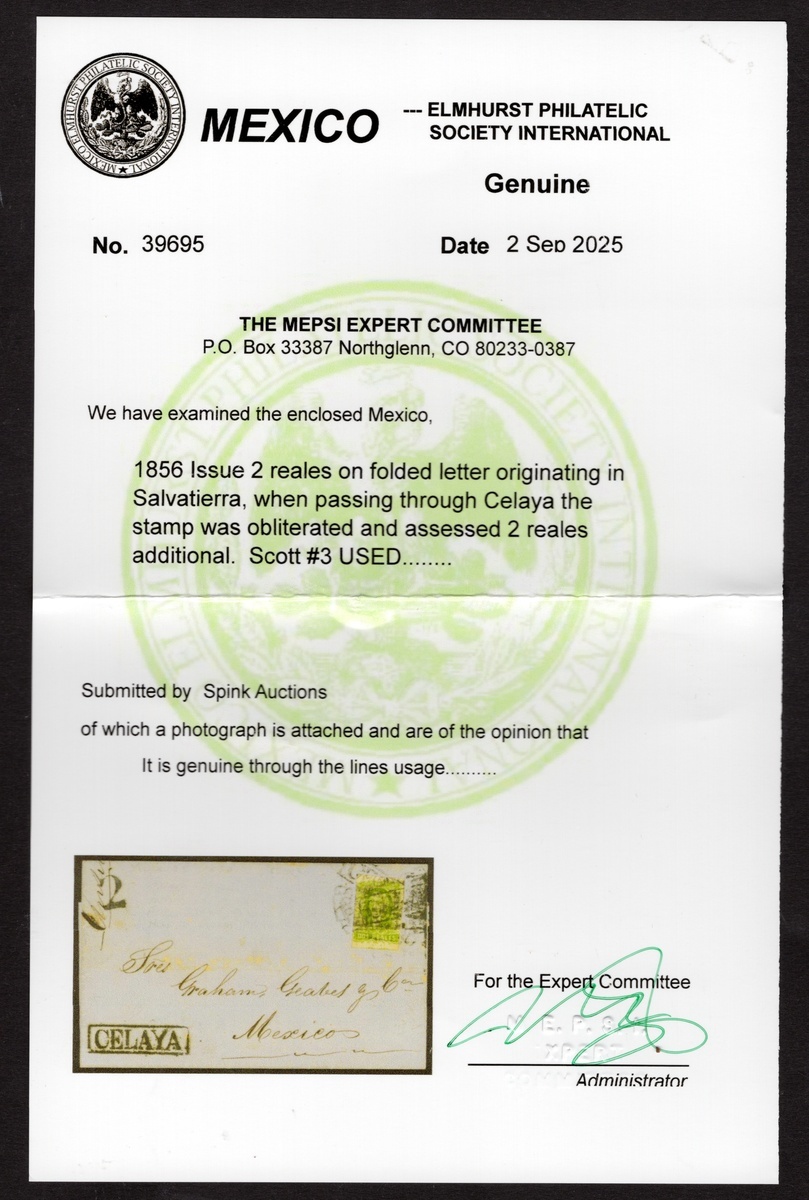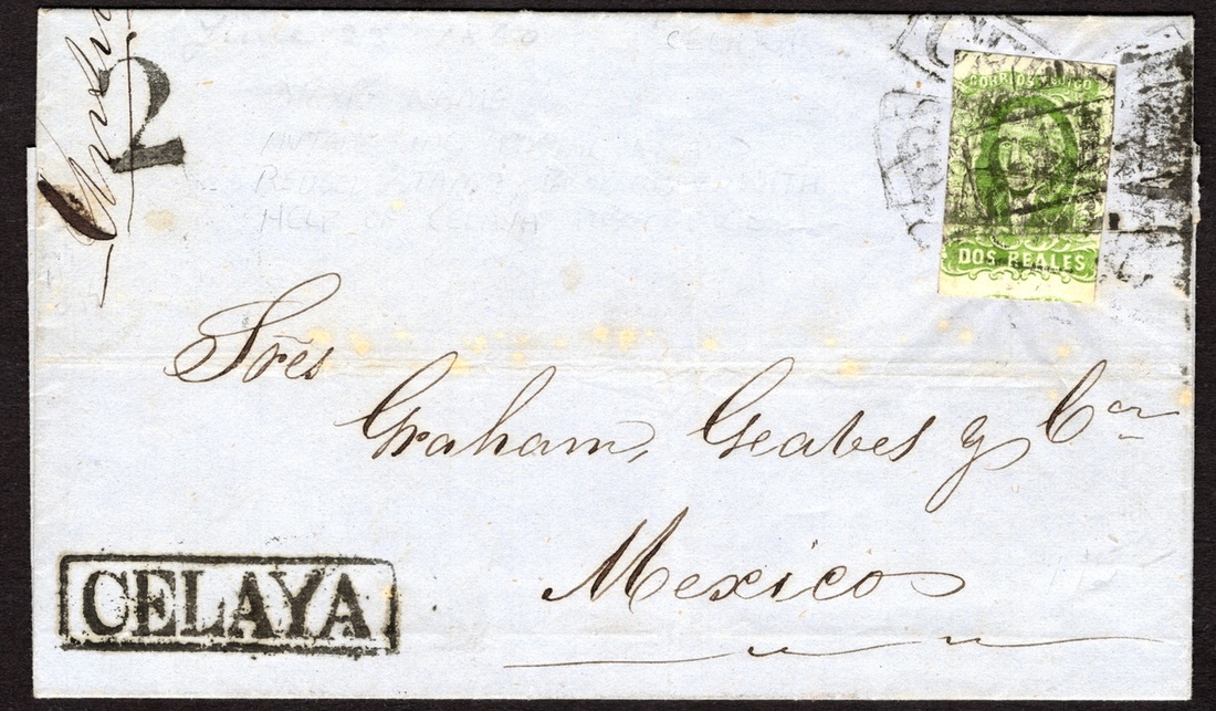 Mexico District 2r. Green, just touching on two sides, on entire letter from Salvatierra and cancelled in Celaya sent to Mexico City on June 22th, 1860. Struck with "2" h.s. indicating "Across the Lines" mail, so stamp was not recognized as valid payment, and so it had to pay 2r. again. 2025 MEPSI certificate. Scott 3.