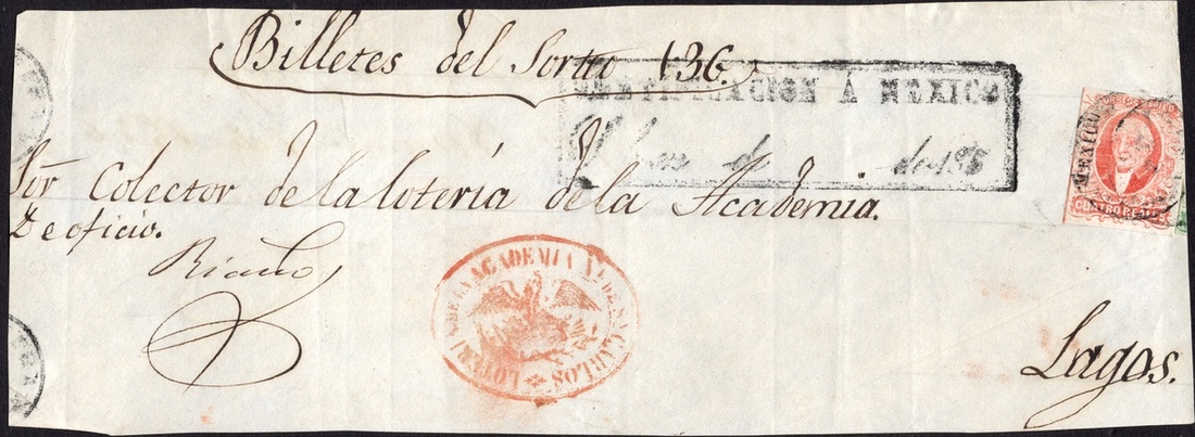 Mexico District 4r. Red, mainly attractive margins, slightly cut into at top right corner, tied by c.d.s. on registered cover front from Mexico City to Lagos, which contained lottery tickets intended for sale in that small destination town, dated November 9, 1856 and carried at single rate. A very scarce example of registered mail, as the front, signed by the addressee to confirm receipt, was required to be destroyed by the post office after two years. Scott 4.,