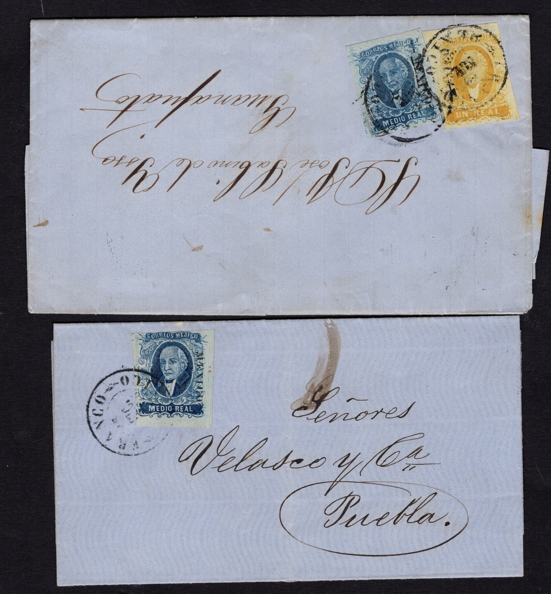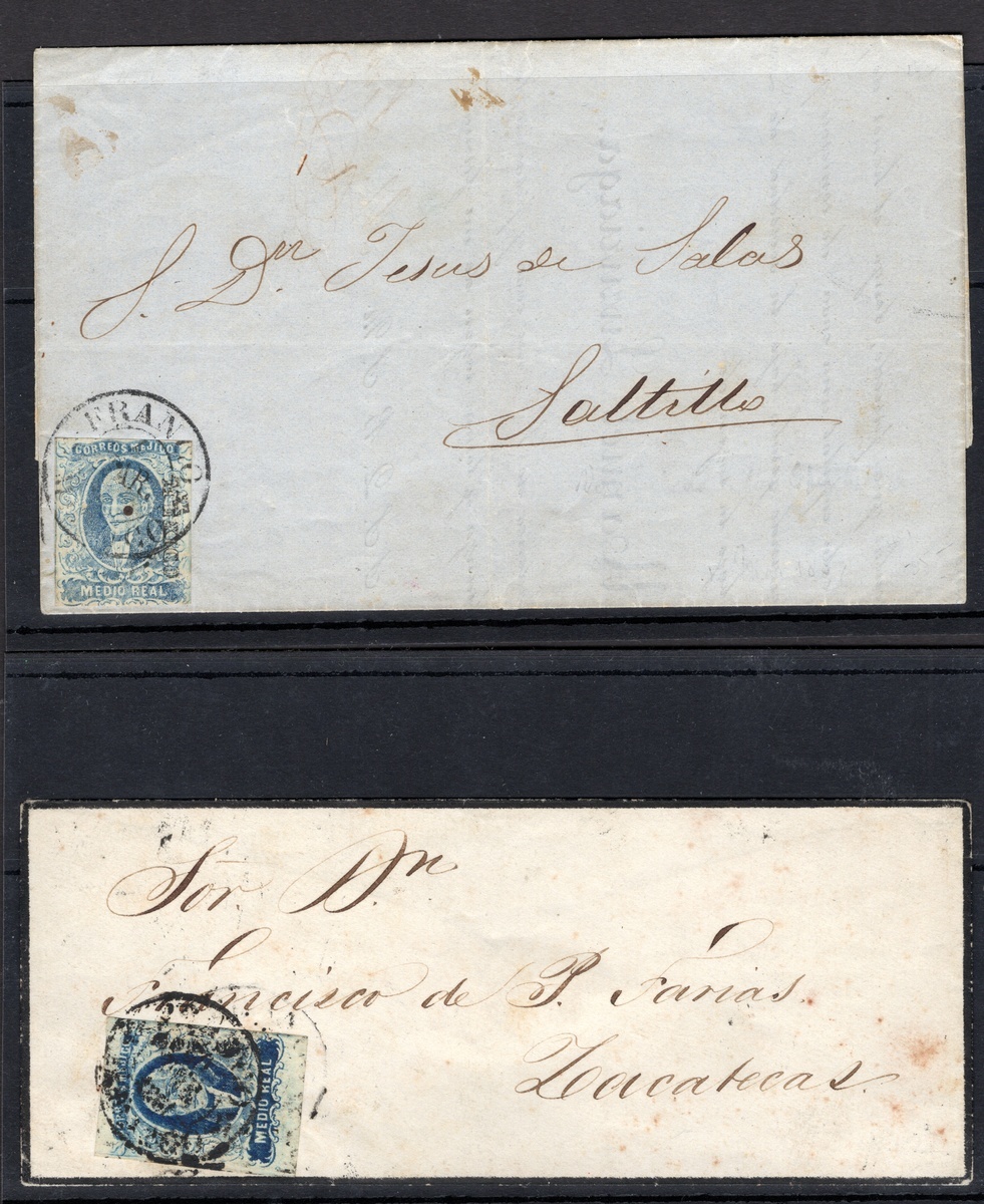Mexico District Group of four covers bearing a ½r. Blue, paying either the first rate or printed matter rate, including one cover dated November 1856 paying the scarce 1½r. rate, another being a printed circular, and a third an unusual mourning cover, also includes one piece with a 4r. and a ½r. pair. Scott 1, 2, 4.,