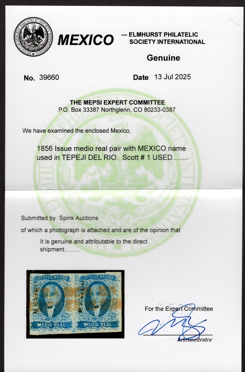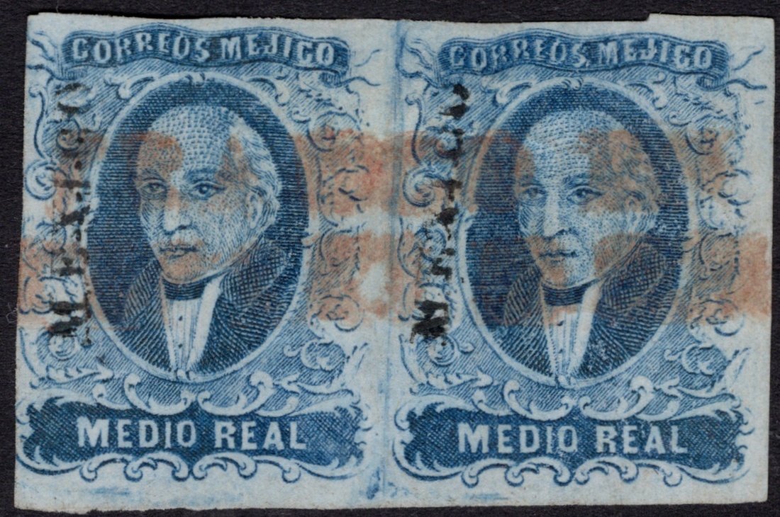 Mexico District-Tepeji del Río ½r. Blue, Mexico overprint, pair with good margins, just slightly touching at left, used with red postmark. Most likely form the direct shipment. Direct shipments were sent either to sub-offices within the Mexico district or to sub-offices in other districts requiring emergency supplies. All are rare and bear either the "Mexico" overprint or none at all. Scott 1; NF $1,200.