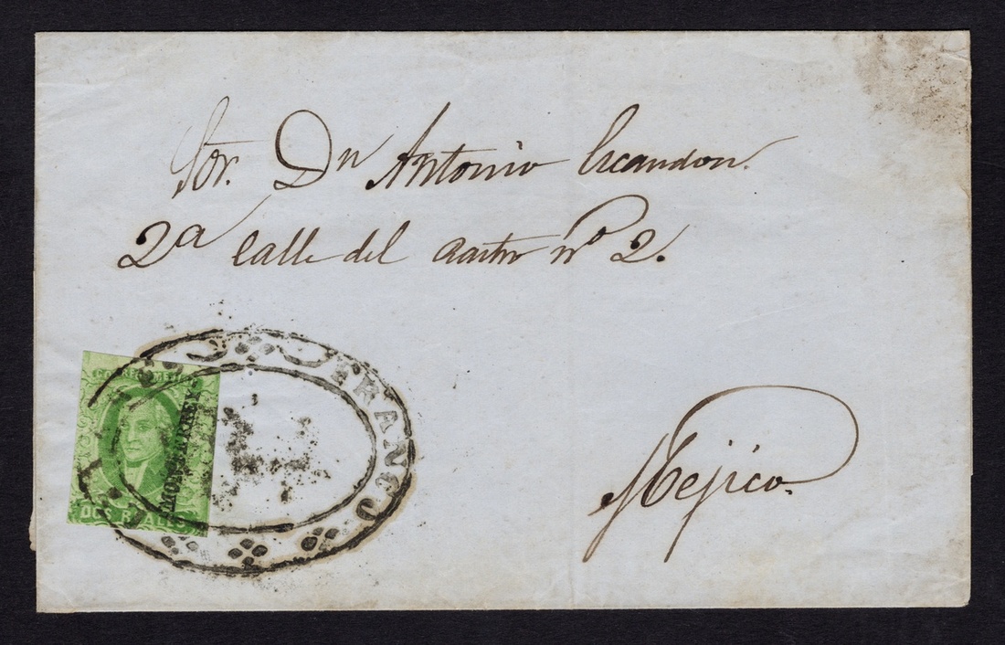 Monterrey Group comprising ½r. Blue block of four (three margins) with framed d.s., slightly touching the design in two places; as well as an attractive cover bearing 2r. Green, tied by a beautiful Linares h.s. Scott 1, 3; NF $300 for the block alone.,