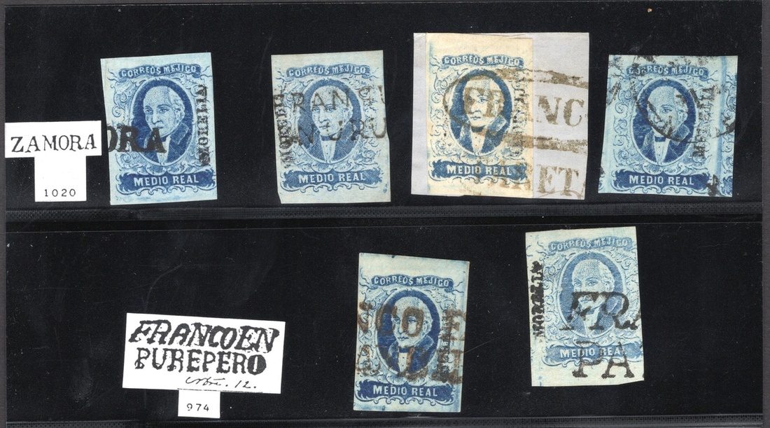 Morelia ½r. Blue, group of six examples from Morelia and five small suboffices: Zamora, Uruapan, Taretan, Purépero and Patzcuaro. All but two with margins all around, including some exceptionally large. A difficult assembly. Scott 1; NF $240 (without premium for suboffices).