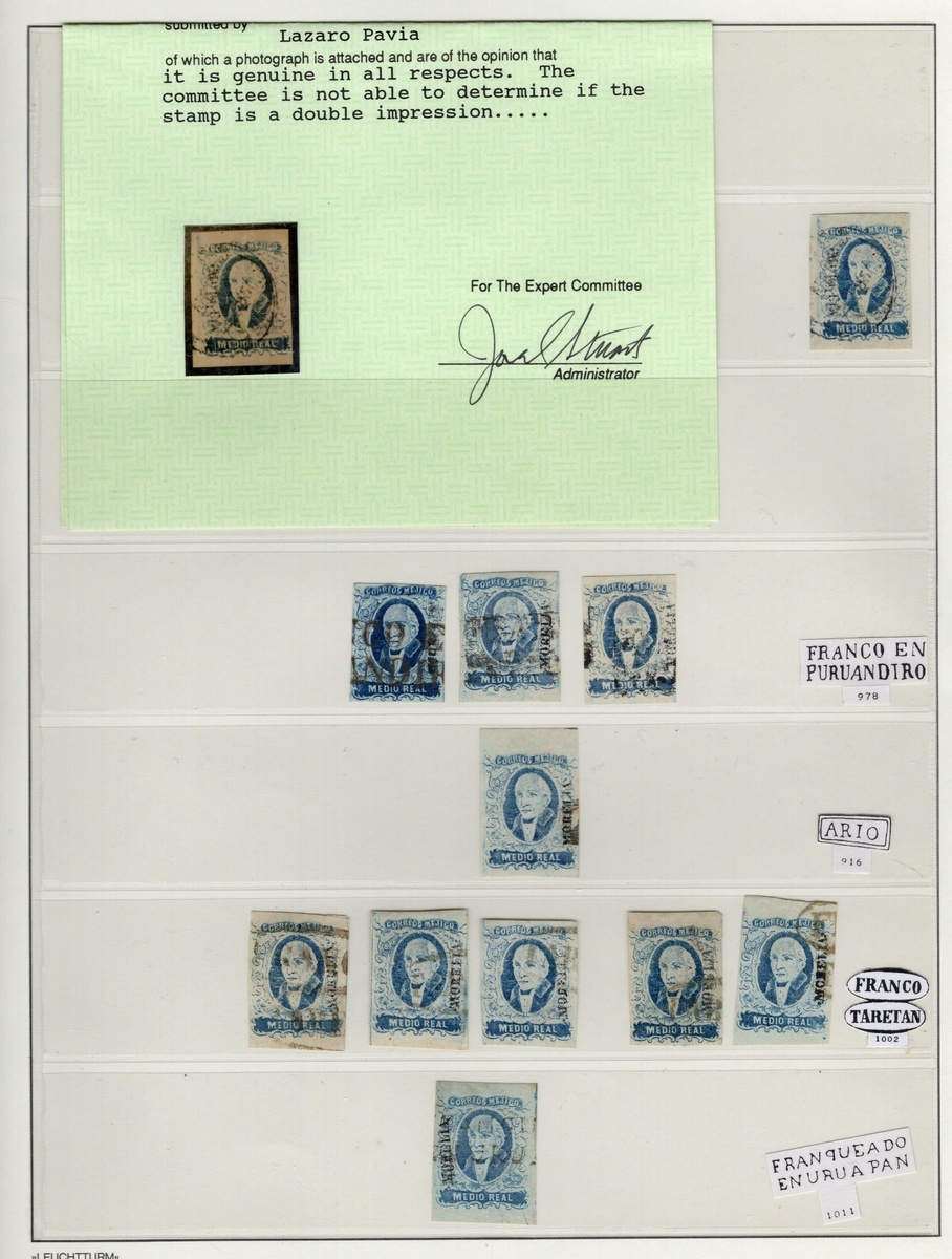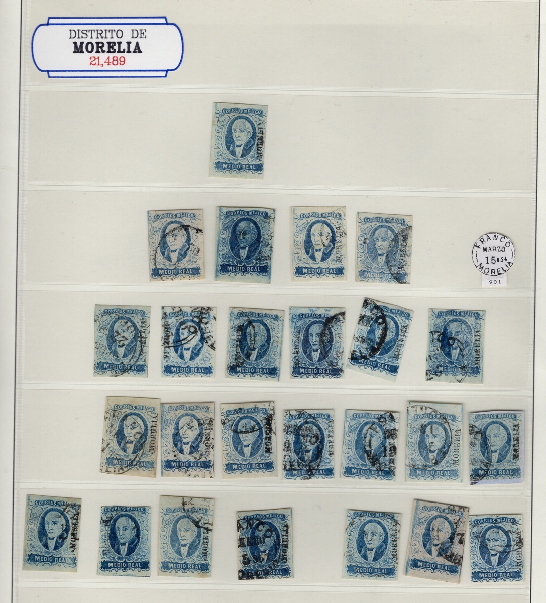 Morelia ½r. Blue, assembly comprising 56 stamps (just one unused), including cancellations from Morelia (MEPSI certificate), Colima, Pátzcuaro, Uruapan, Ario, Puruándiro, and Tartan. Good condition throughout, mainly showing three or four margins. Scott 1; NF $2,250.