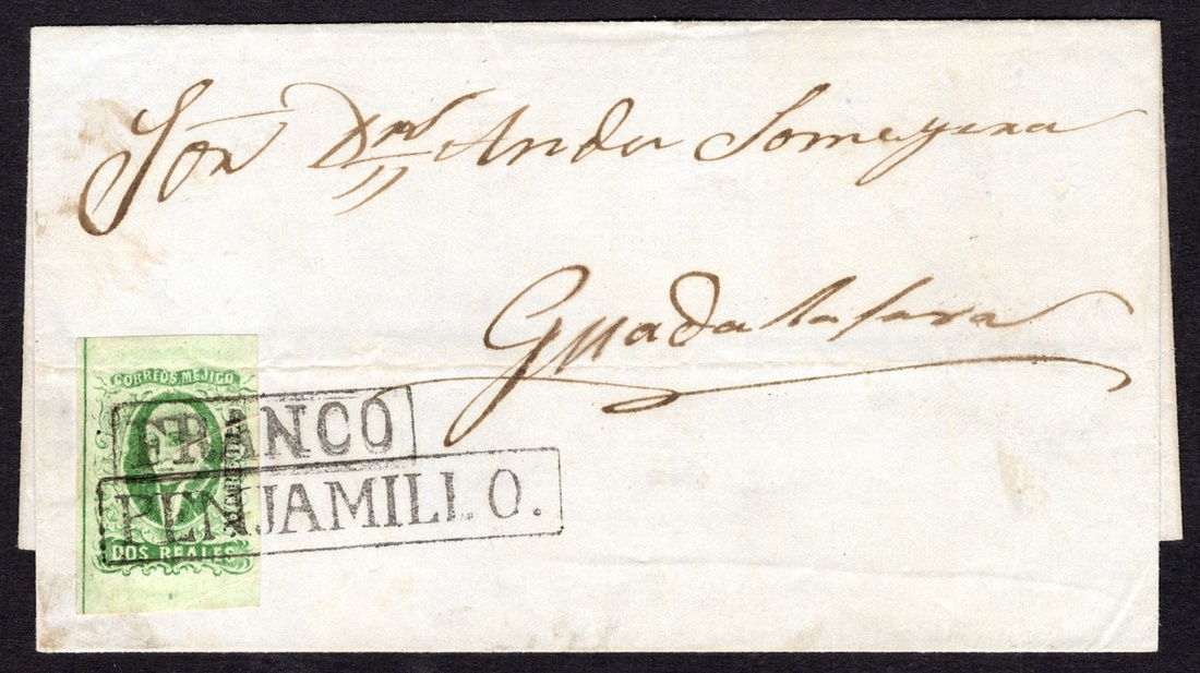 Morelia 2r. Dark Green first plate with frame line at left, wide plate, natural paper fold, huge margins all around, on February 6, 1857 cover, tied by both Penjamillo postmarks. A rare example of both cancels used together. Scott 3 var.