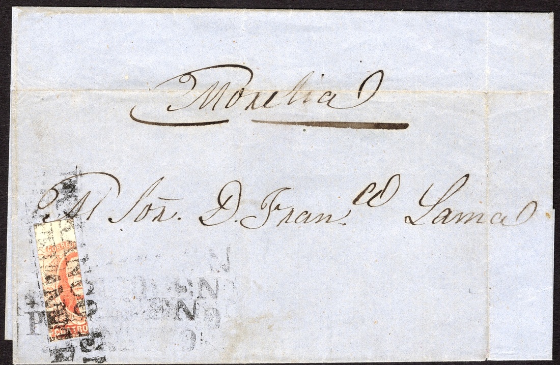 Morelia 4r. Red, bisect just cut into at bottom, otherwise close to good margins, used on cover from Puruándiro to Morelia dated May 15, 1858. The multiple cancels may be hiding a postal fraud. 2025 MEPSI certificate. Scott 4a.
