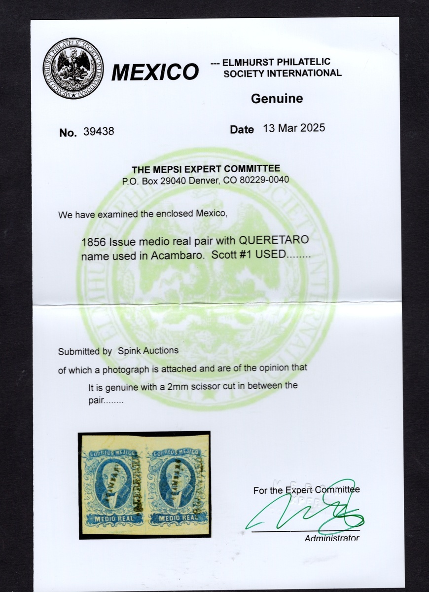 Querétaro ½r. Blue, pair with large margins, showing rare tiny Acámbaro linear cancel. 2 mm scissor's cut at top in between the pair. 2025 MEPSI certificate. Scott 1.