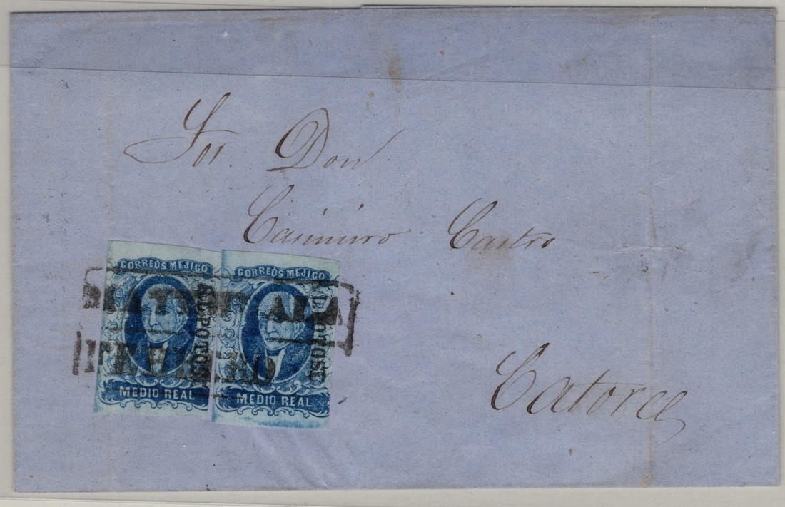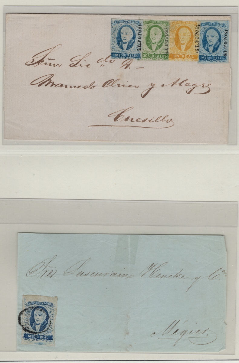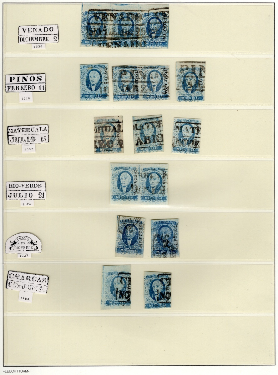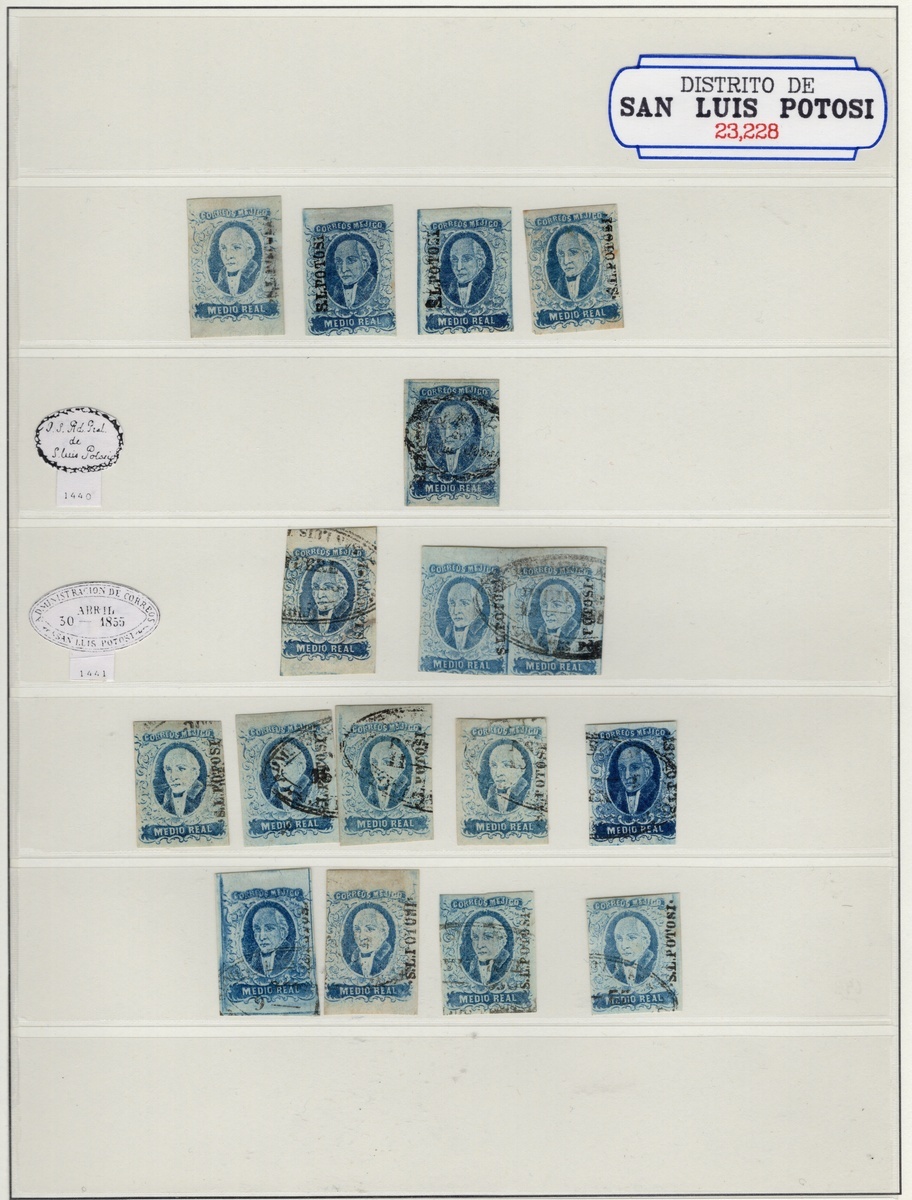 San Luis Potosí ½r. Blue, assembly comprising 52 stamps, of which four unused, two covers and one cover front, exhibiting postmarks of San Luis Potosí, Catorce, Venado, Pinos, Matehuala, Río Verde and Charcas. The highlights are a stunning Venado strip of three with huge margins, and a very fine cover from San Luis Potosí to Cuesillo. Good condition throughout, mainly exhibiting examples with three or four margins. Scott 1; NF $1,880 for the stamps off cover.,,
