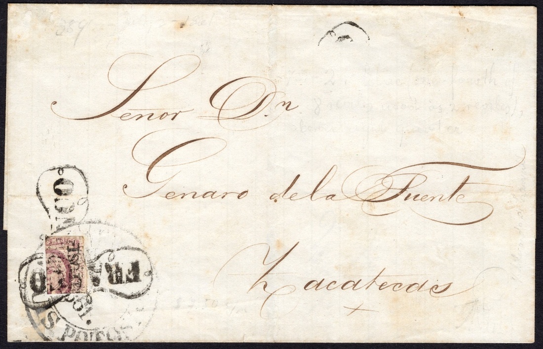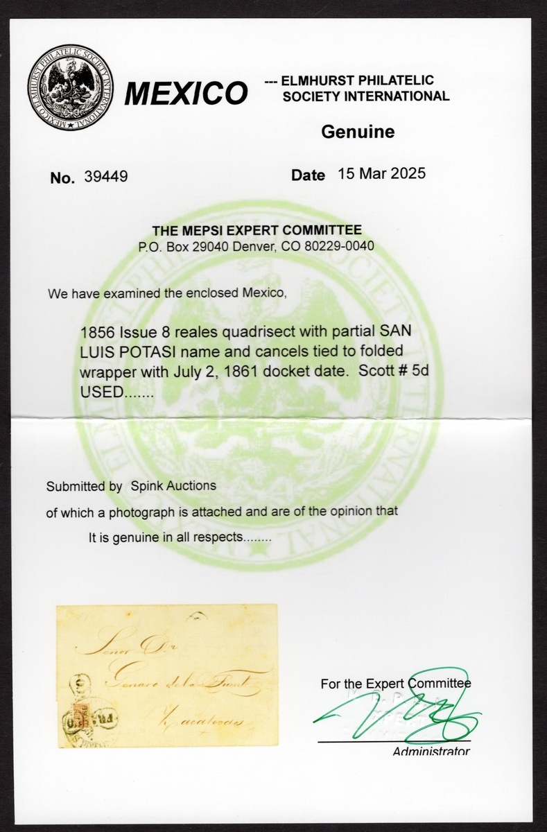 San Luis Potosí 8r. Lilac, quadrisect on cover dated July 2, 1861, with various handstamp strikes tying the franking. A very rare provisional usage, since the issue had been demonetized on April 20. Very few known. Signed Bash and 2025 MEPSI certificate. Scott 5d.