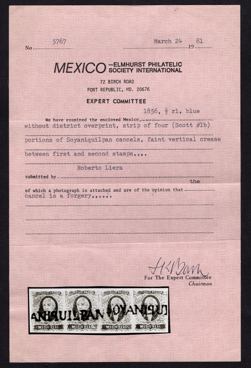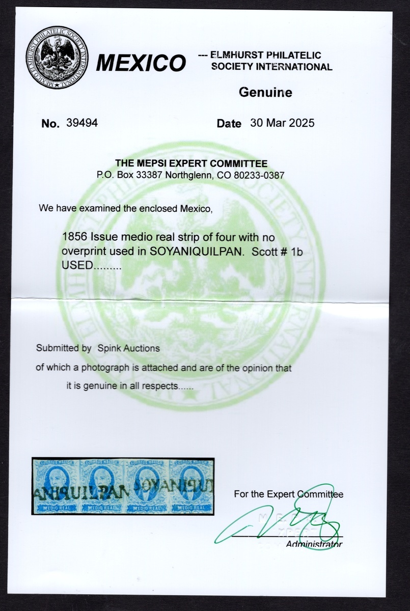 Soyaniquilpam ½r. Blue, strip of four without overprint, used and with margins slightly cut into at top and bottom, attractively used with h.s. Only 820 were issued. This strip was originally given a 1981 MEPSI negative certificate stating that the cancels were fake probably due to the lack of overprints, however MEPSI changed the opinion to genuine in 2025; the former certificate states a faint vertical crease between the first and second stamps. Scott 1b; NF $4,000