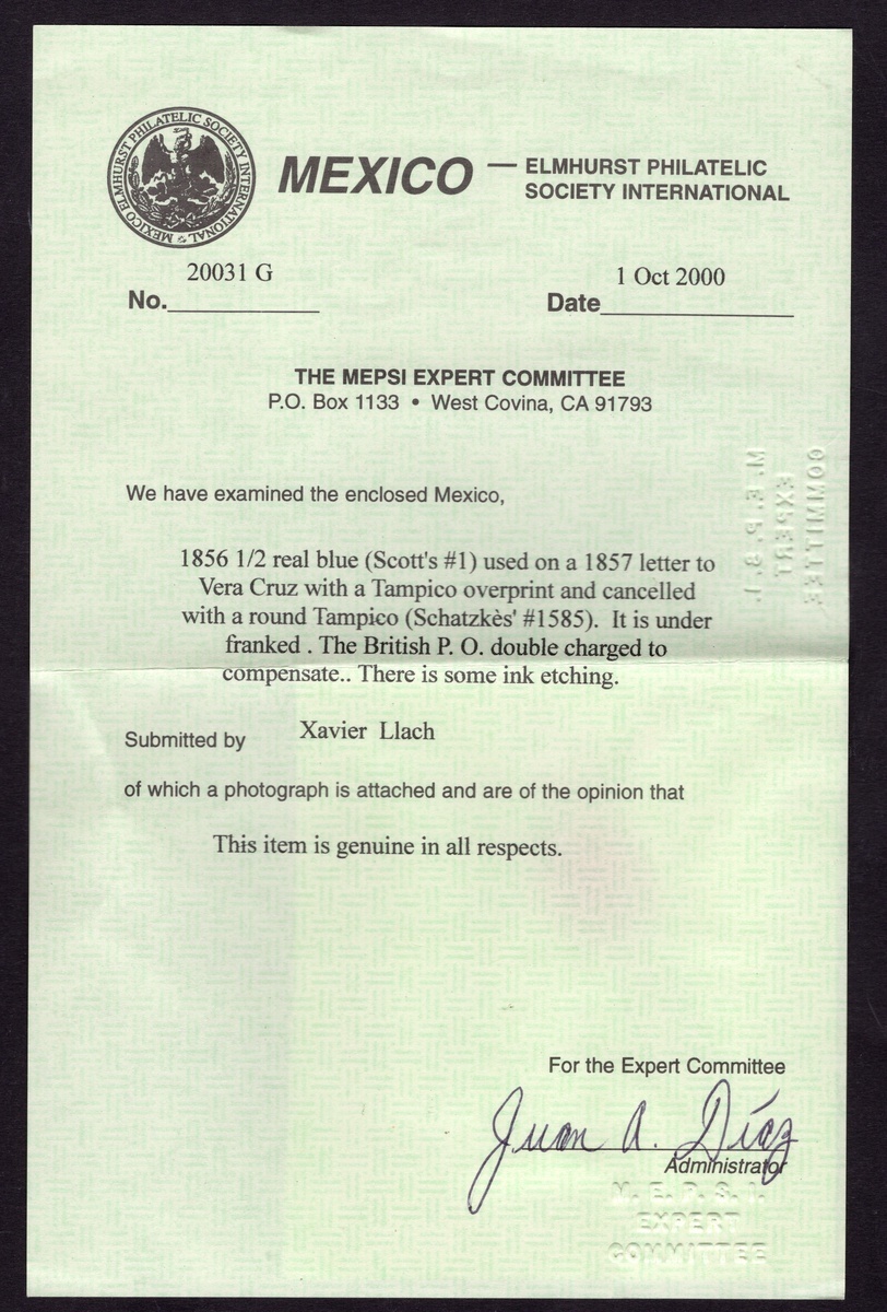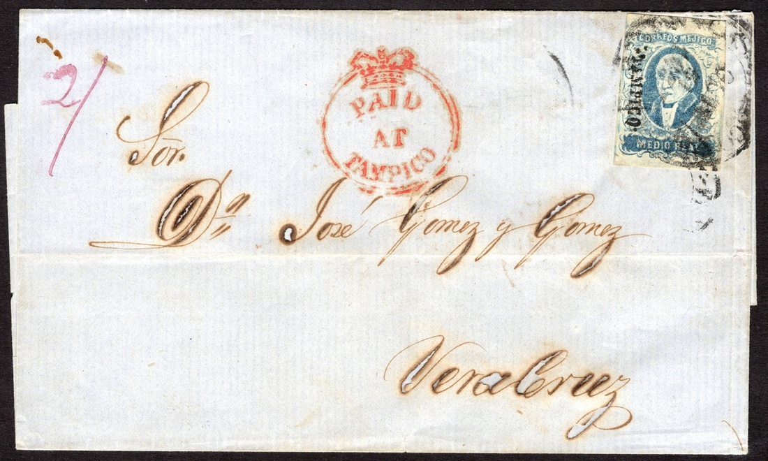 Tampico ½r. Blue on maritime cover to Veracruz, margins all around and c.d.s. on October 31, 1857, bearing the spectacular Tampico Crown h.s and d.s. -both applied in red- from the British agency. Some ink etching. A very rare underpaid usage (it should have been 1 real to the port of embark). 2000 Mepsi certificate. Scott 1.