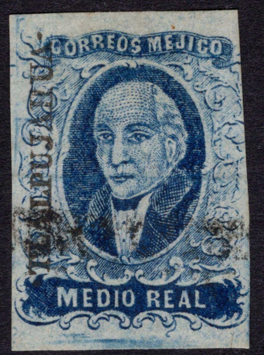 Tlalpujahua ½r. Blue, three good margins, touching at right, used with postmark. Very attractive and fresh appearance. Scott 1; NF $400.