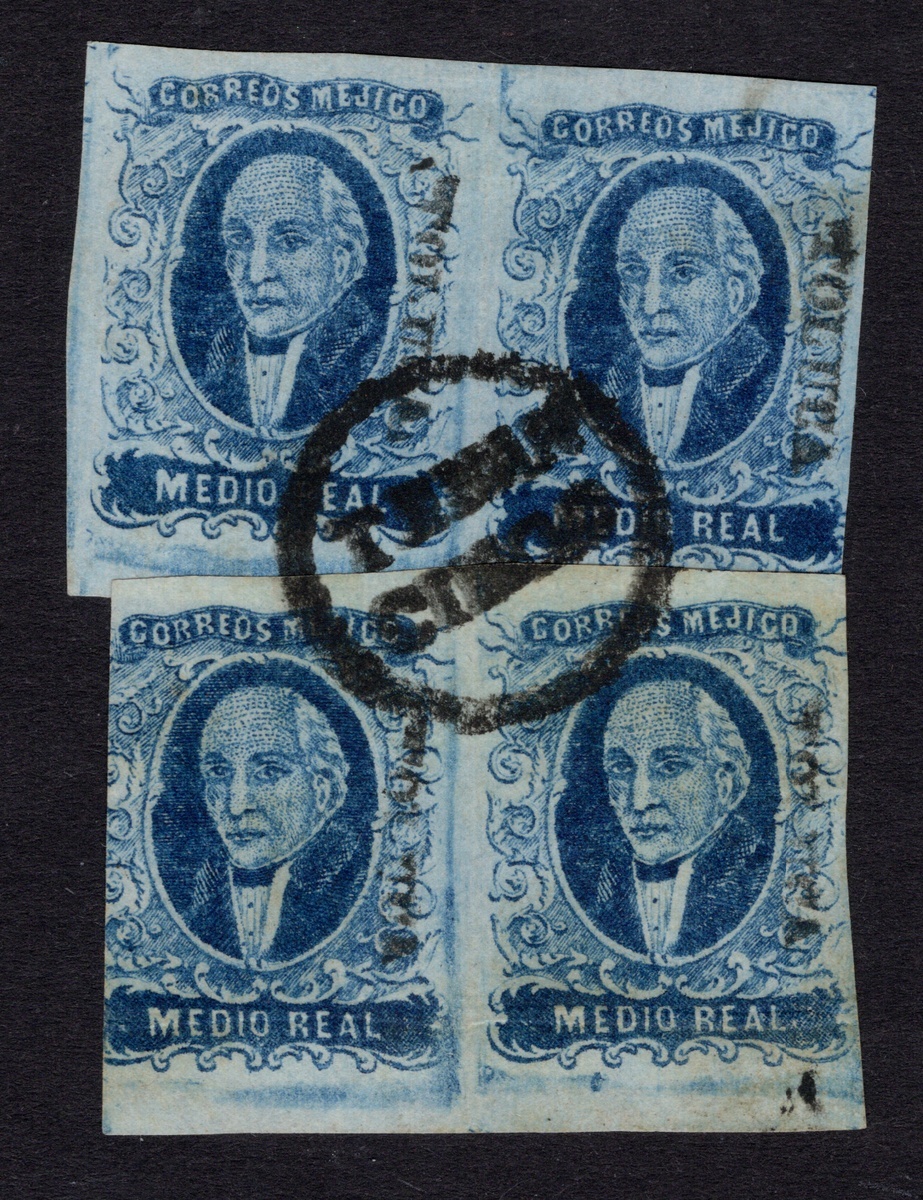Toluca ½r. Blue, two used pairs, each centrally cancelled with the Tenancingo handstamp, rejoined to resemble a block of four. Well-margined overall, with the exception of the bottom left stamp slightly cut into. This combination most likely originated together and represents an attractive and scarce multiple. Signed Aguirre. Scott 1.
