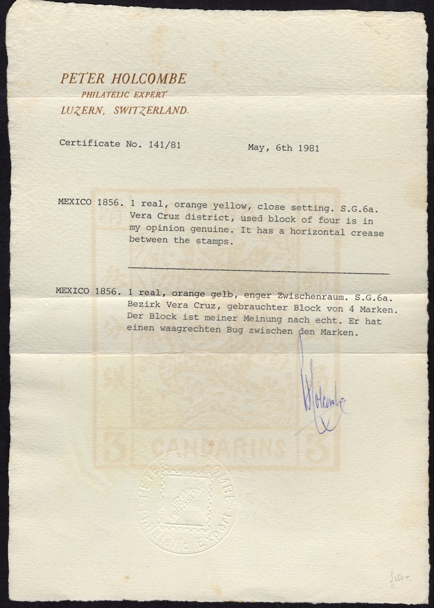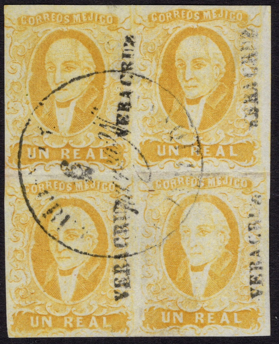 Veracruz 1r. Yellow, block of four, slightly touched or cut into at right and base, otherwise good margins, bright shade and clear impression, cancelled with Veracruz h.s. Horizontal crease between stamps not detracting. 1981 Holcombe certificate. Scott 2; NF $1,150.,