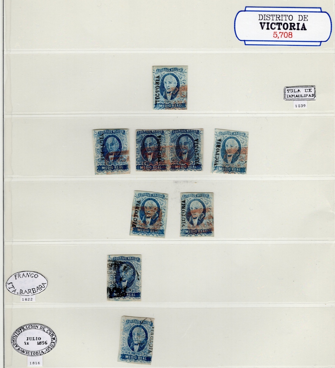 Victoria ½r. Blue, group of nine used stamps, including cancellations from Victoria, Tula de Tamaulipas, and Santa Bárbara. Overall very fine. Scott 1; NF $900 as off cover stamps.,