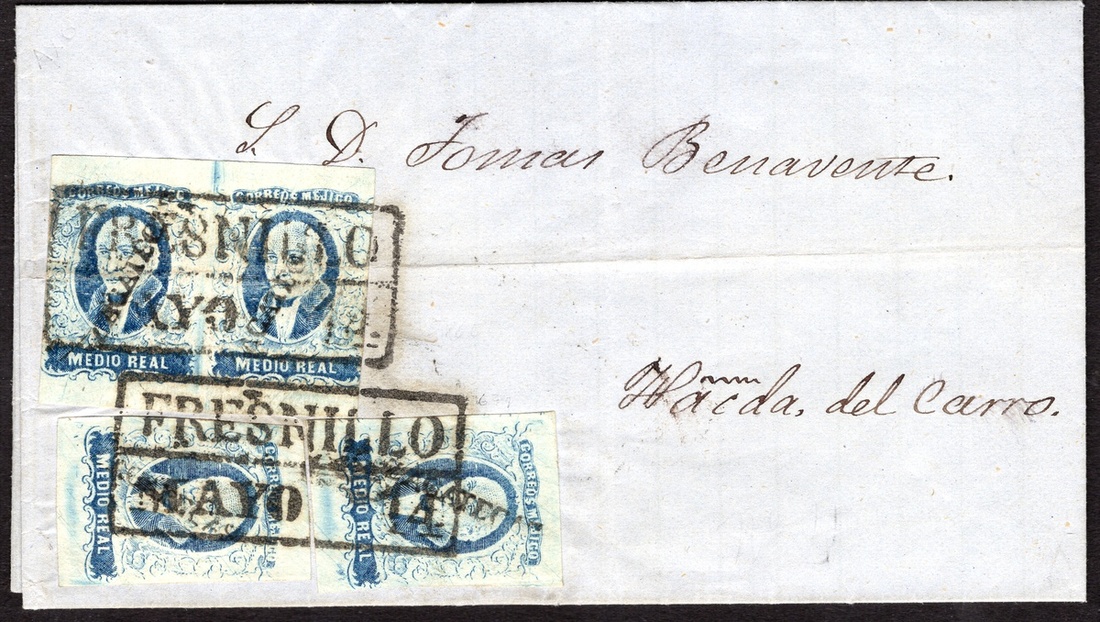 Zacatecas ½r. Blue, pair and two singles, mostly huge margins, tied to pristine entire letter framed d.s. from Fresnillo to Hacienda del Carro, dated May 14, 1861. This is a scarce Provisional Use as the stamps were demonetized on April 20. Scott 1.