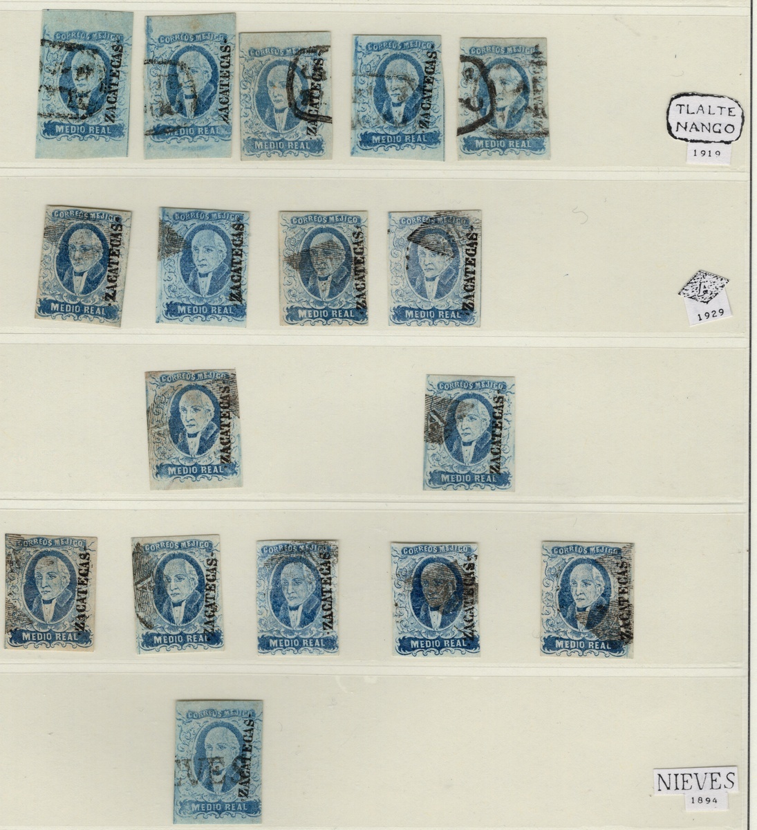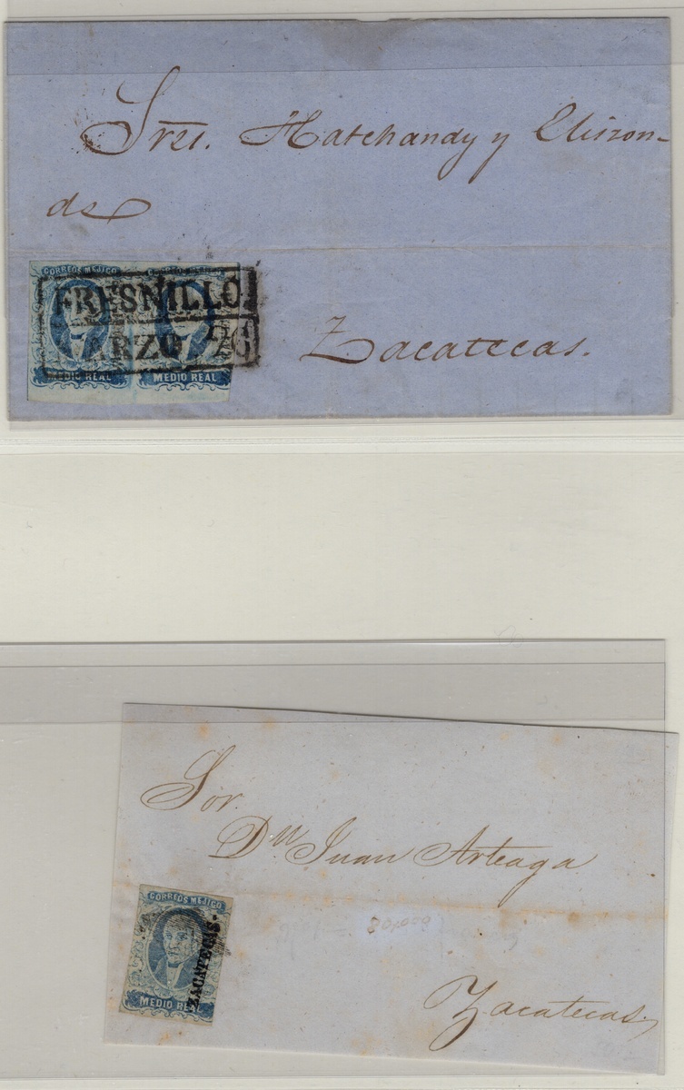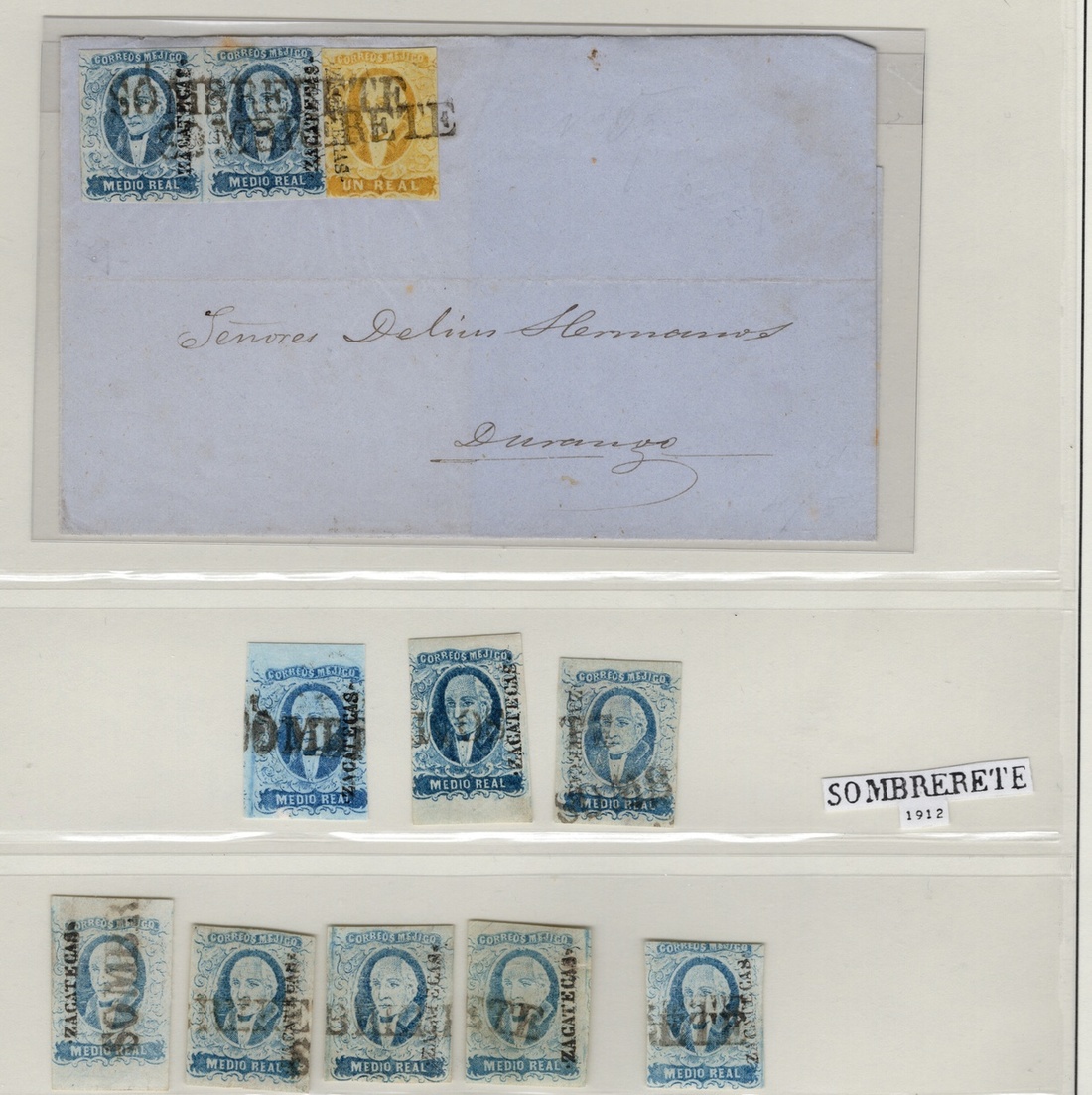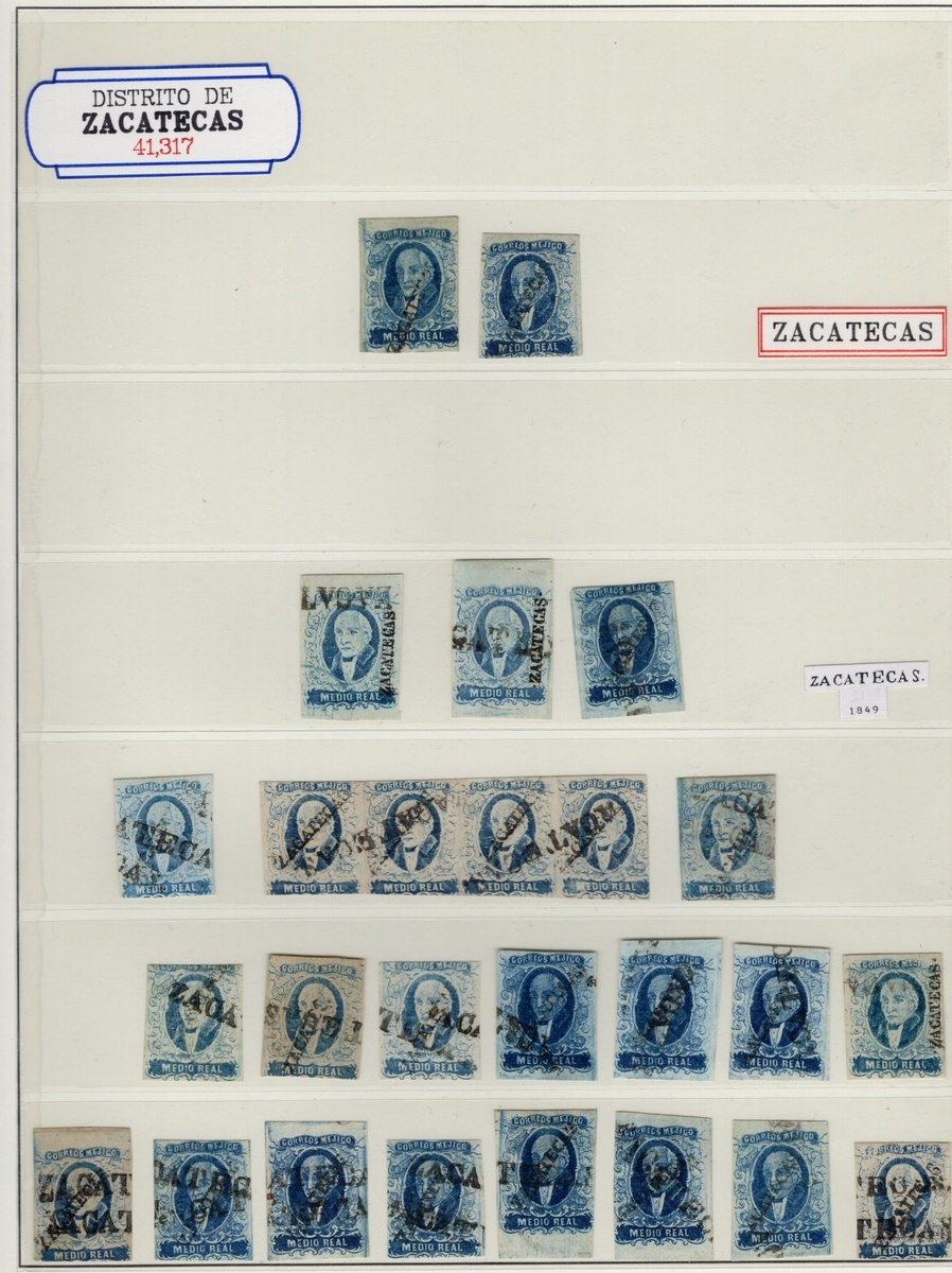 Zacatecas ½r. Blue, assembly of circa 138 stamps (two unused), three covers, and two cover fronts, one of which bearing a bi-color franking from Sombrerete. Cancellations include Aguascalientes, Zacatecas, Sombrerete, Tlaltenango, Nieves, Santo Alto, Angostadero, Juchipila, Chalchihuites, Fresnillo, and Río Grande. Generally very fine, mainly showing three or four margins. One 1997 MEPSI certificate. Scott 1; NF$ 4,830 as off cover stamps., ,