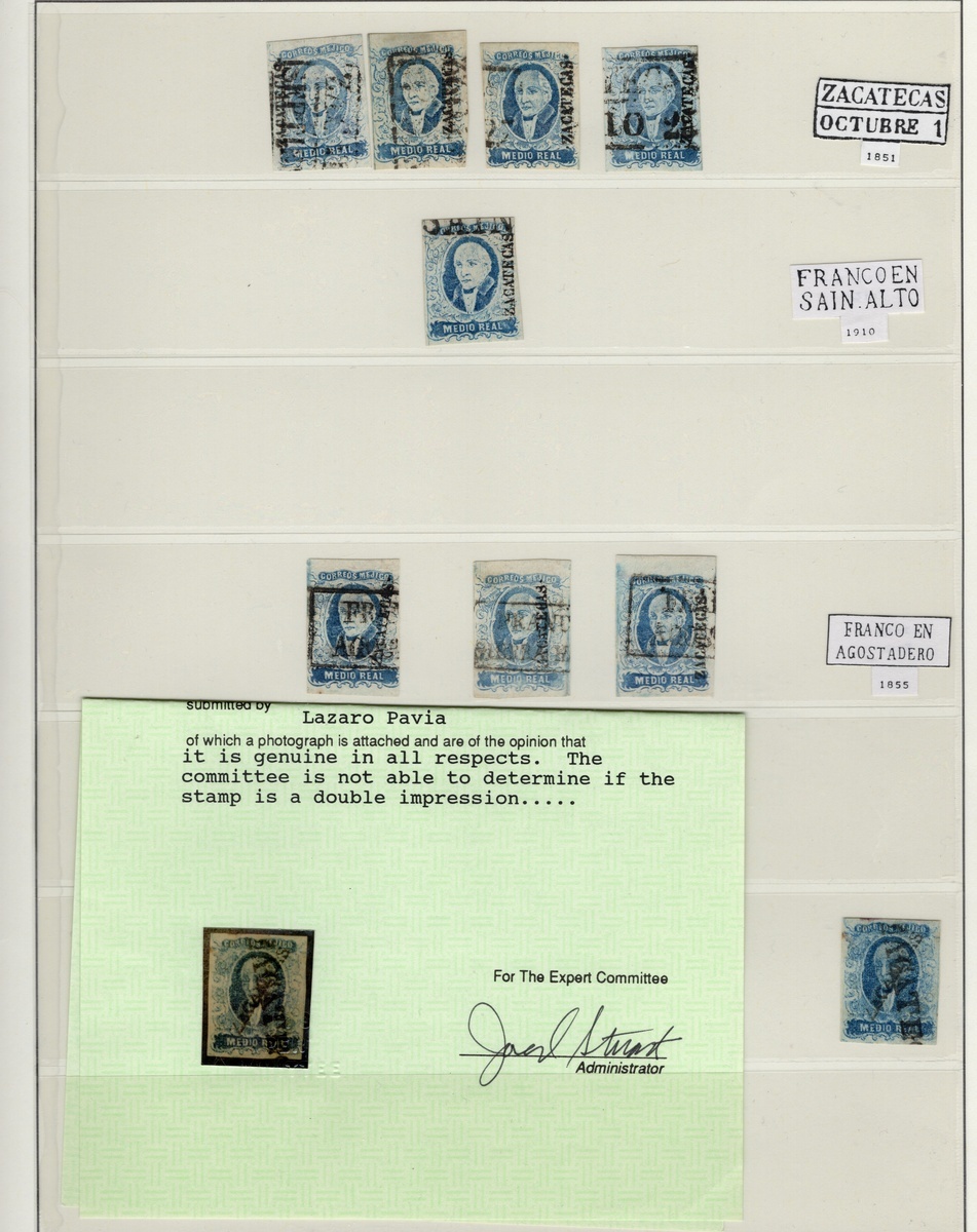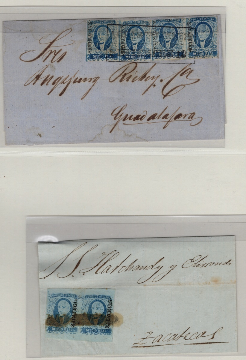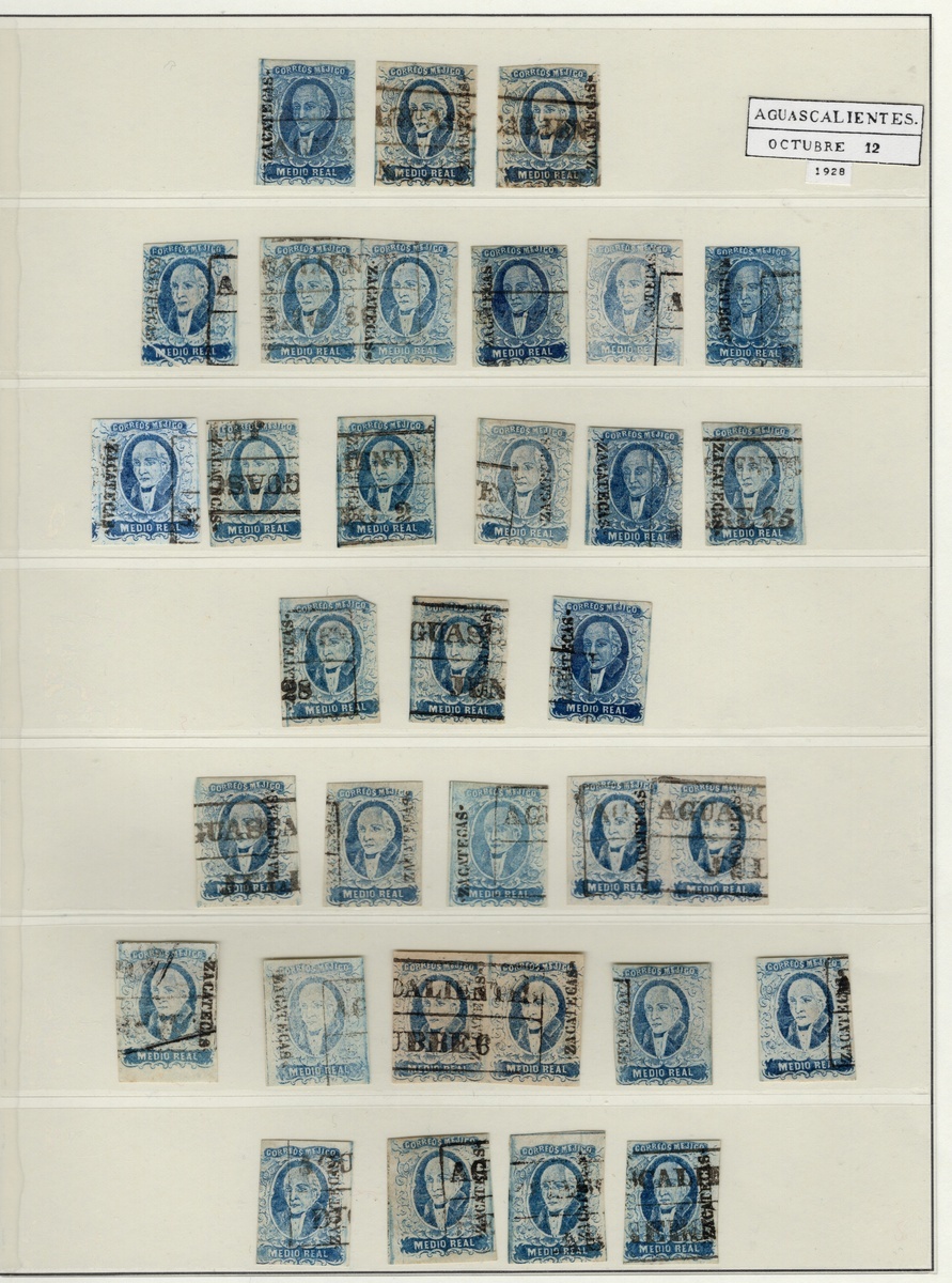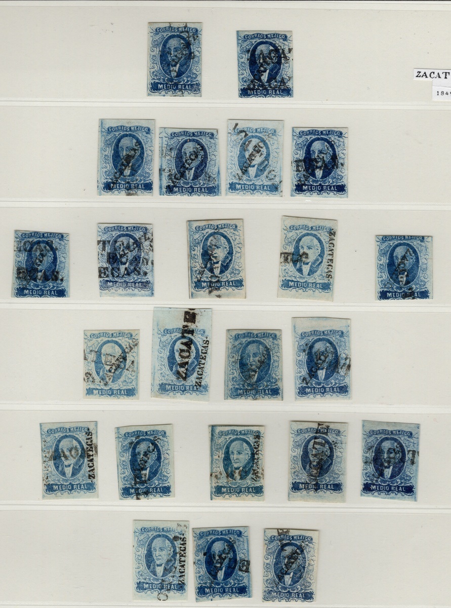 Zacatecas ½r. Blue, assembly of circa 138 stamps (two unused), three covers, and two cover fronts, one of which bearing a bi-color franking from Sombrerete. Cancellations include Aguascalientes, Zacatecas, Sombrerete, Tlaltenango, Nieves, Santo Alto, Angostadero, Juchipila, Chalchihuites, Fresnillo, and Río Grande. Generally very fine, mainly showing three or four margins. One 1997 MEPSI certificate. Scott 1; NF$ 4,830 as off cover stamps., ,