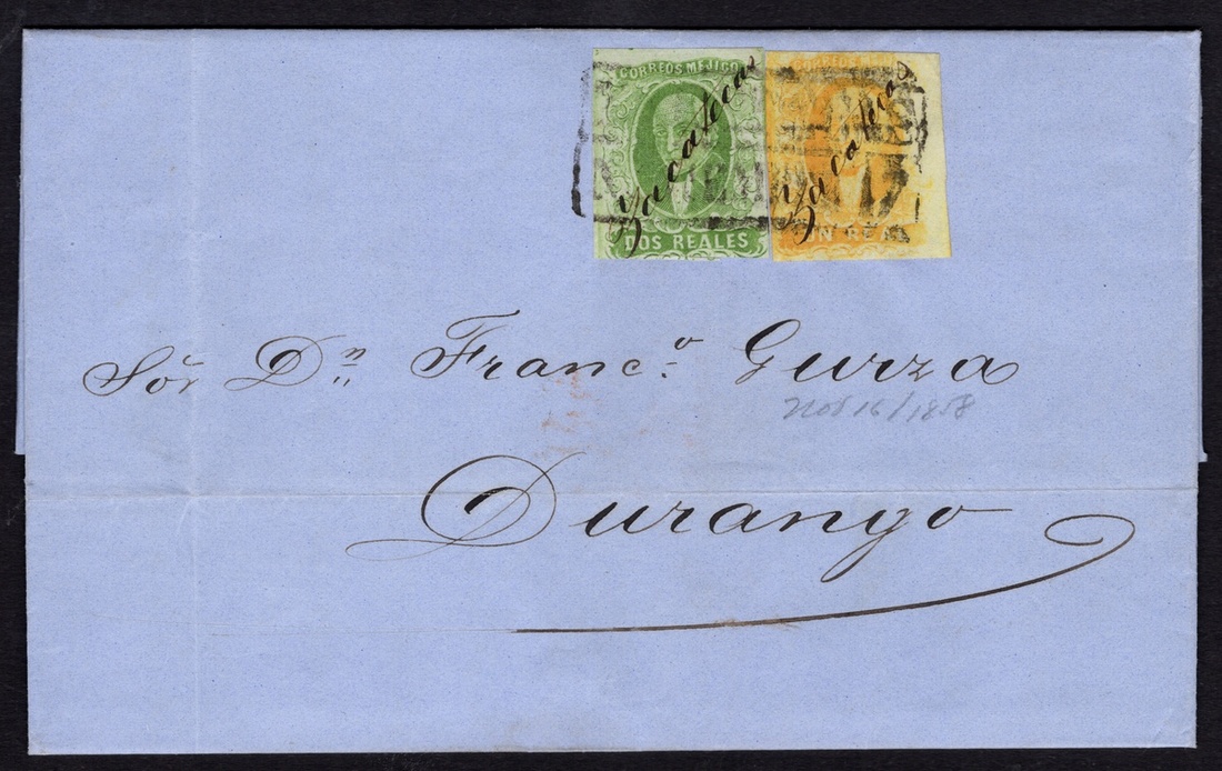 Zacatecas 1r. Yellow and 2r. Green, just cut into on one side, both with manuscript Zacatecas overprint on Nov. 16, 1858 entire letter from Zacatecas to Durango dated November 16, 1858, with the 1r. featuring the "incomplete design at right" variety (NF 2pv4). A very rare combination and apparently not recorded in the 2022 Census. Scott 2, 3.