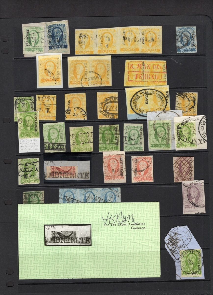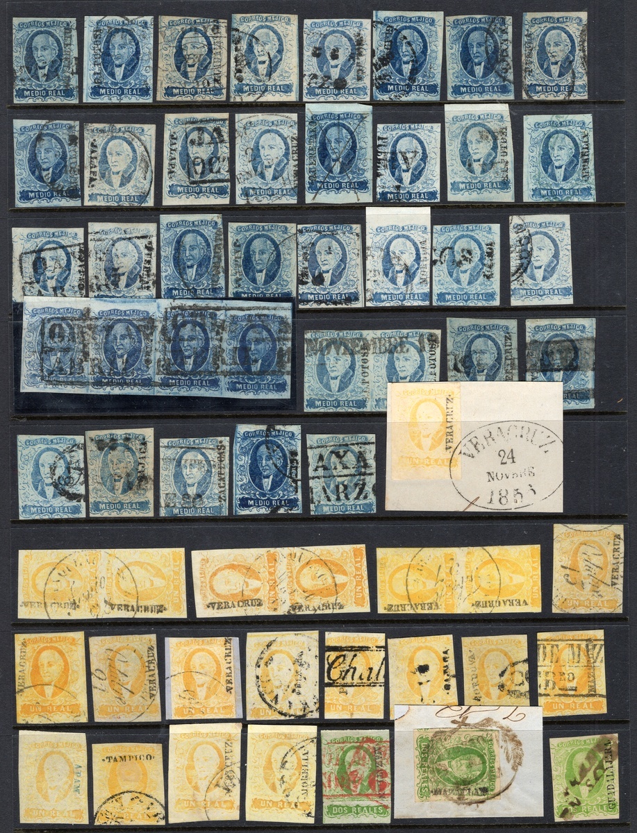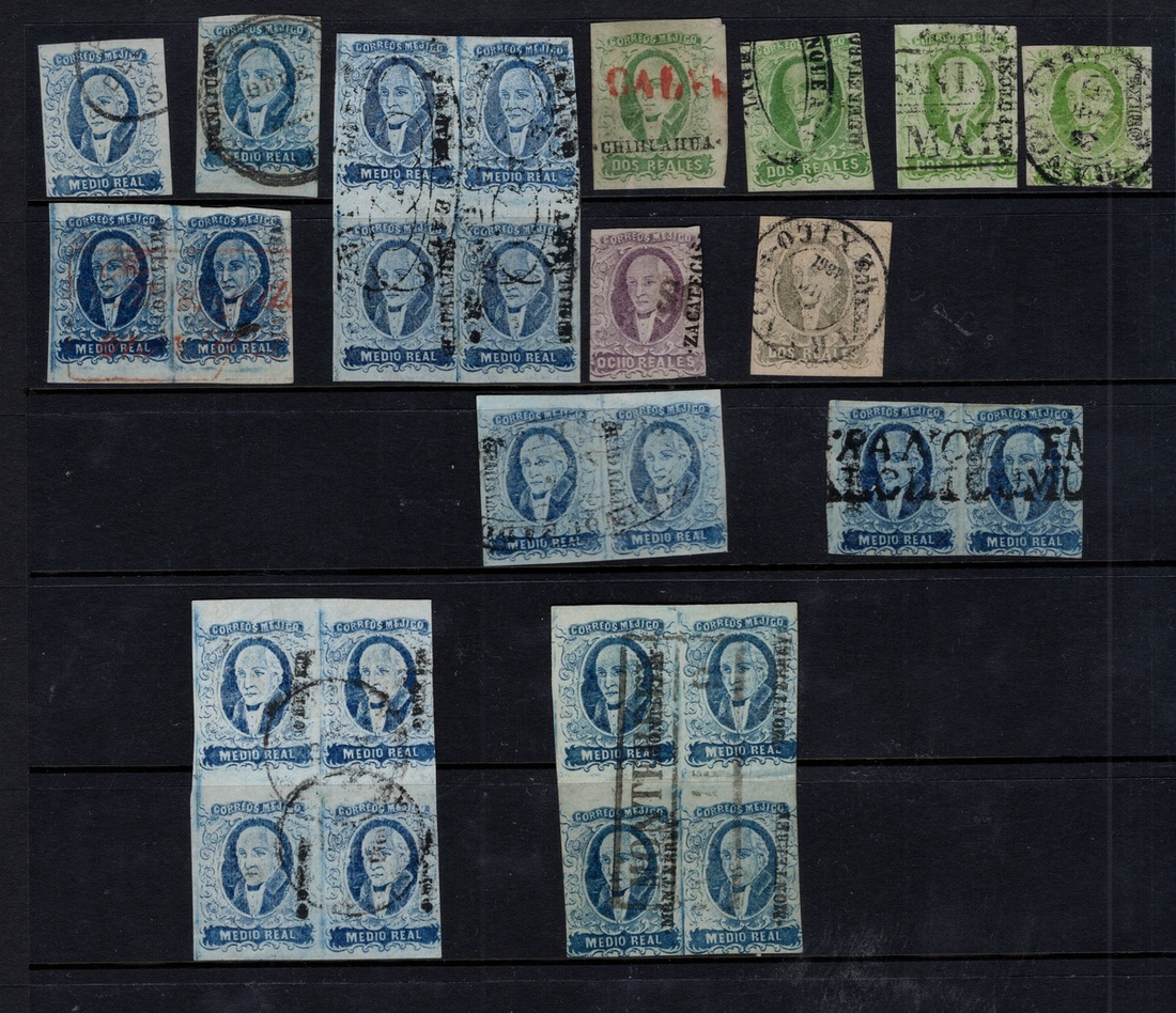 Various Districts Assembly comprising over 115 used stamps, including many districts such as Apam, Chihuahua, Guadalajara, Querétaro, San Luis Potosí, Mexico, Zacatecas, Puebla, Jalapa, Huejutla, Veracruz, Morelia, Oaxaca, Lagos, Orizava, Mazatlán, and others. Over 60 are ½r. blue, and there are three 8r. lilac (one with jumbo margins). Several small-town cancellations enhance this lot, including Sombrerete (a bisect on piece with MEPSI certificate), Atlixco, Tuxpan, Temascaltepec, San Juan de los Lagos, San Juan del Río, Chalchicomula, and Sayula. The lot also includes three blocks of four ½r. blue from Monterrey, Guadalajara, and Mexico, a rare strip of four 1r. yellow from Puebla, and a Zacatecas manuscript overprint. Mixed condition, but many stamps possess three or four margins. Scott 1, 2, 3, 3b, 4, 5, 5b. Scott and NF (for multiples) $5,290.,