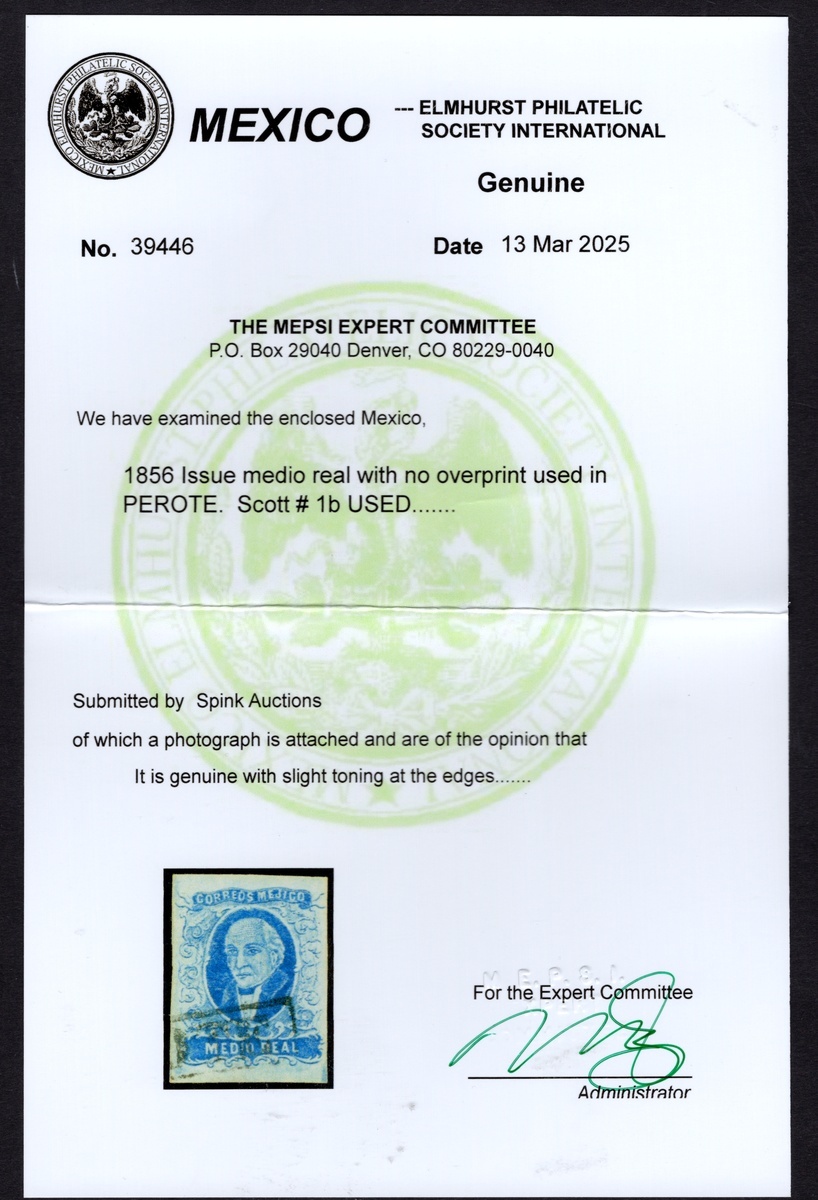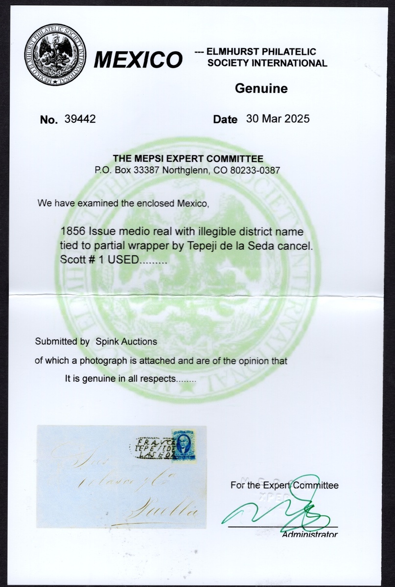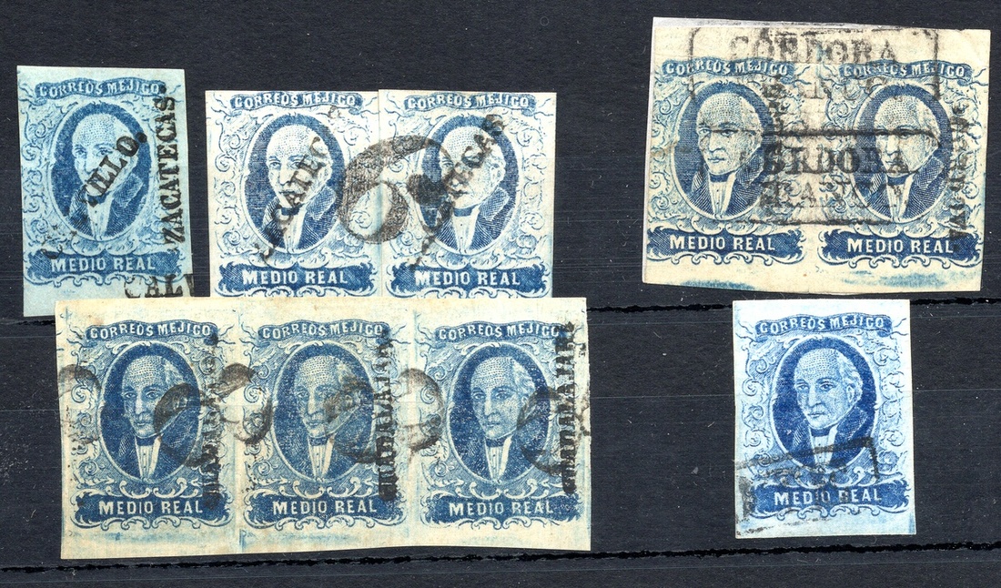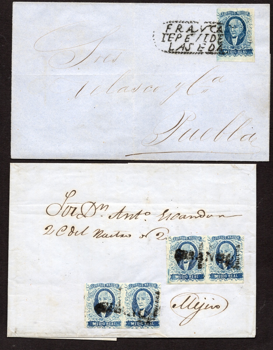 Various Districts ½r. Blue group of two attractive covers and nine stamps. The covers include: Toluca entire with two pairs not tied but with clear docketing and a partial wrapper with a single from Puebla with four margins, tied with h.s. from Tepeji de la Seda, and with a 2025 MEPSI certificate. The stamps are from Zacatecas, Guadalajara, Cordova and one unoveprinted lightly struck Perote, aged and with foxing with a MEPSI certificate which does not attribute it to the direct shipment. Most of the stamps have full margins all around and look fresh; NF for the off-cover stamps is $335- $2,300. Scott 1, 1b.