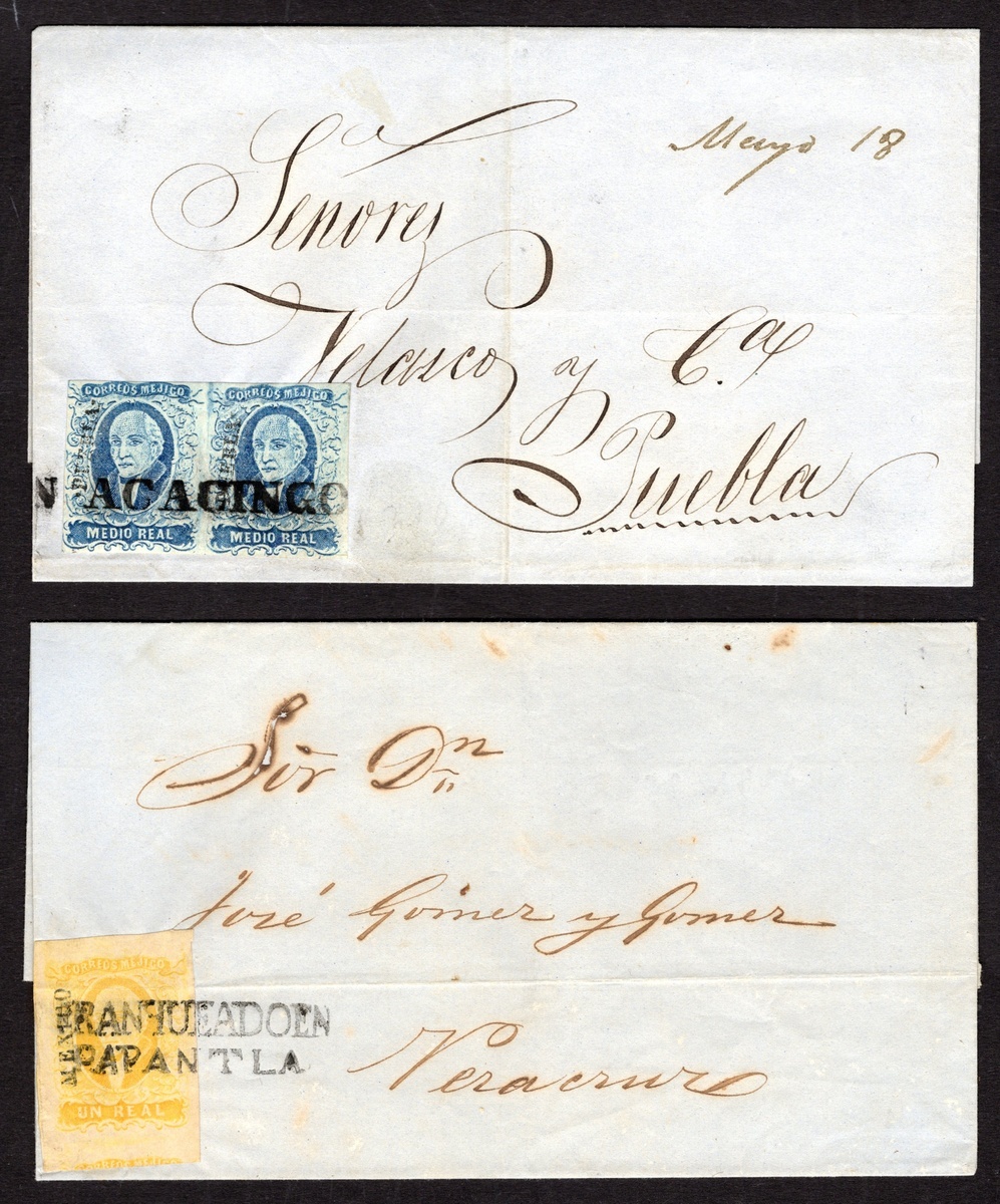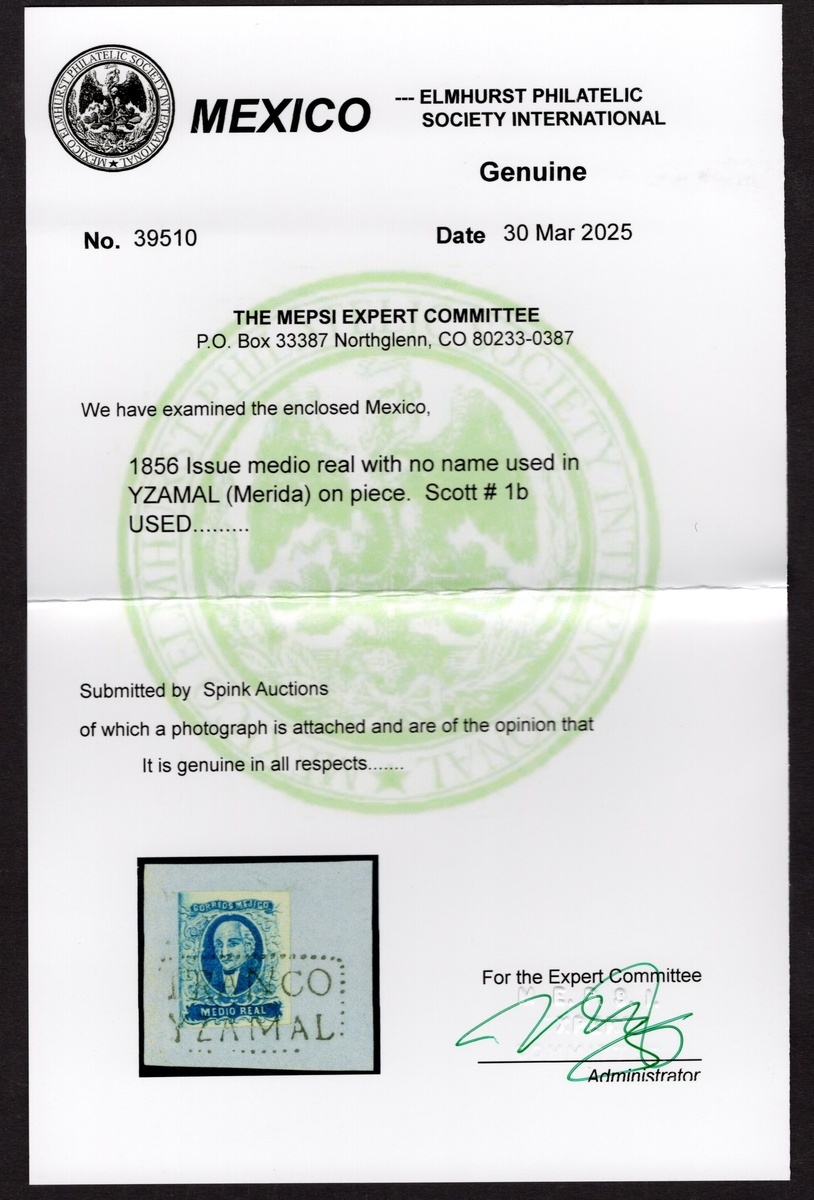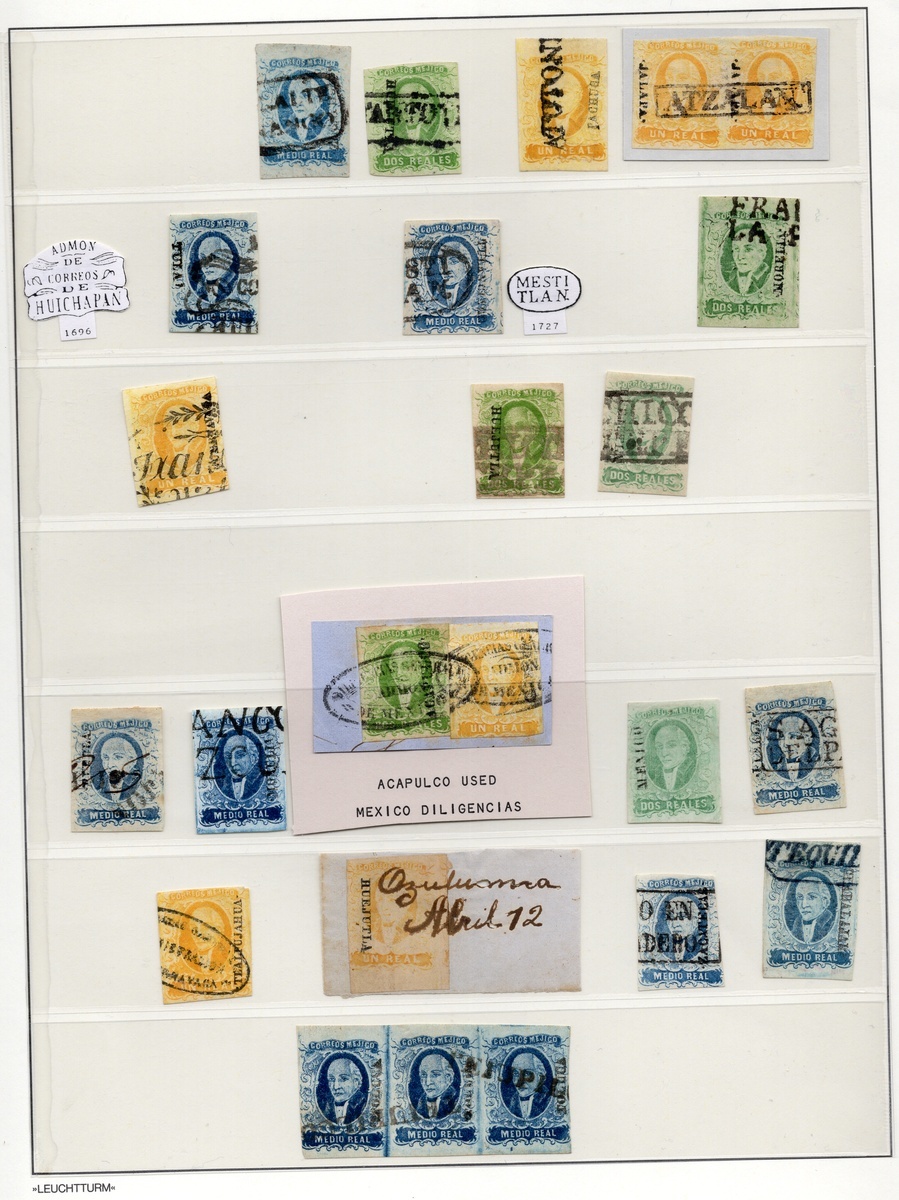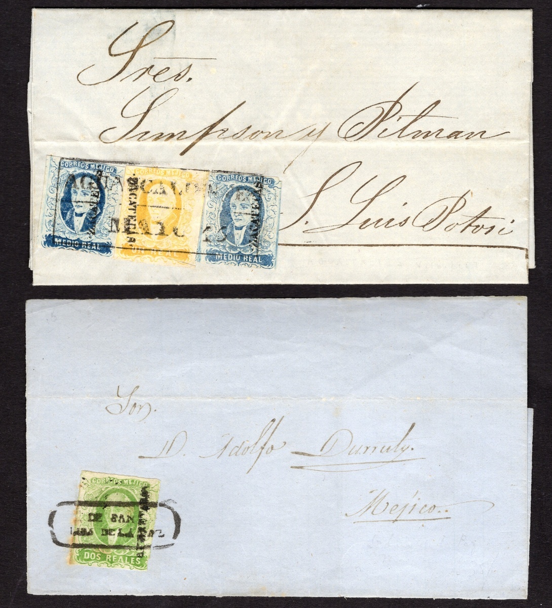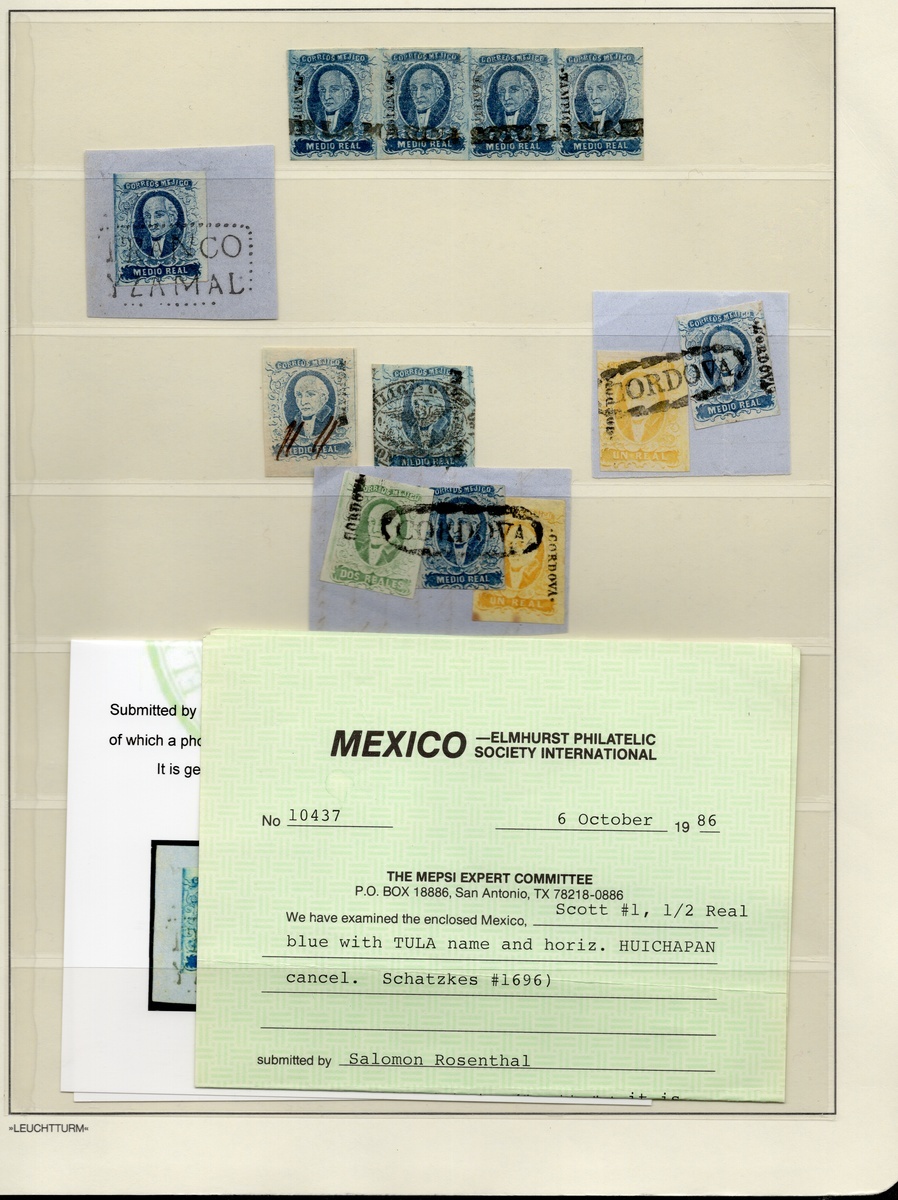 Various Districts Group of 34 stamps used and unused, as well as four covers. The stamps include usages from Zacatecas, Huejutla, Tula, Tulancingo, Guadalajara, Toluca, Mérida, Tlalpujahua, Puebla, Morelia, Tampico, Mexico, Acapulco and Jalapa; while the covers originate from Querétaro, Zacatecas, Toluca, Puebla and Mexico. Mixed condition, but with several stamps possessing three or four margins. Two 1983 and 2025 MEPSI certificates. Scott 1, 2, 3, 3b; NF $1,619 for off-cover stamps.,,