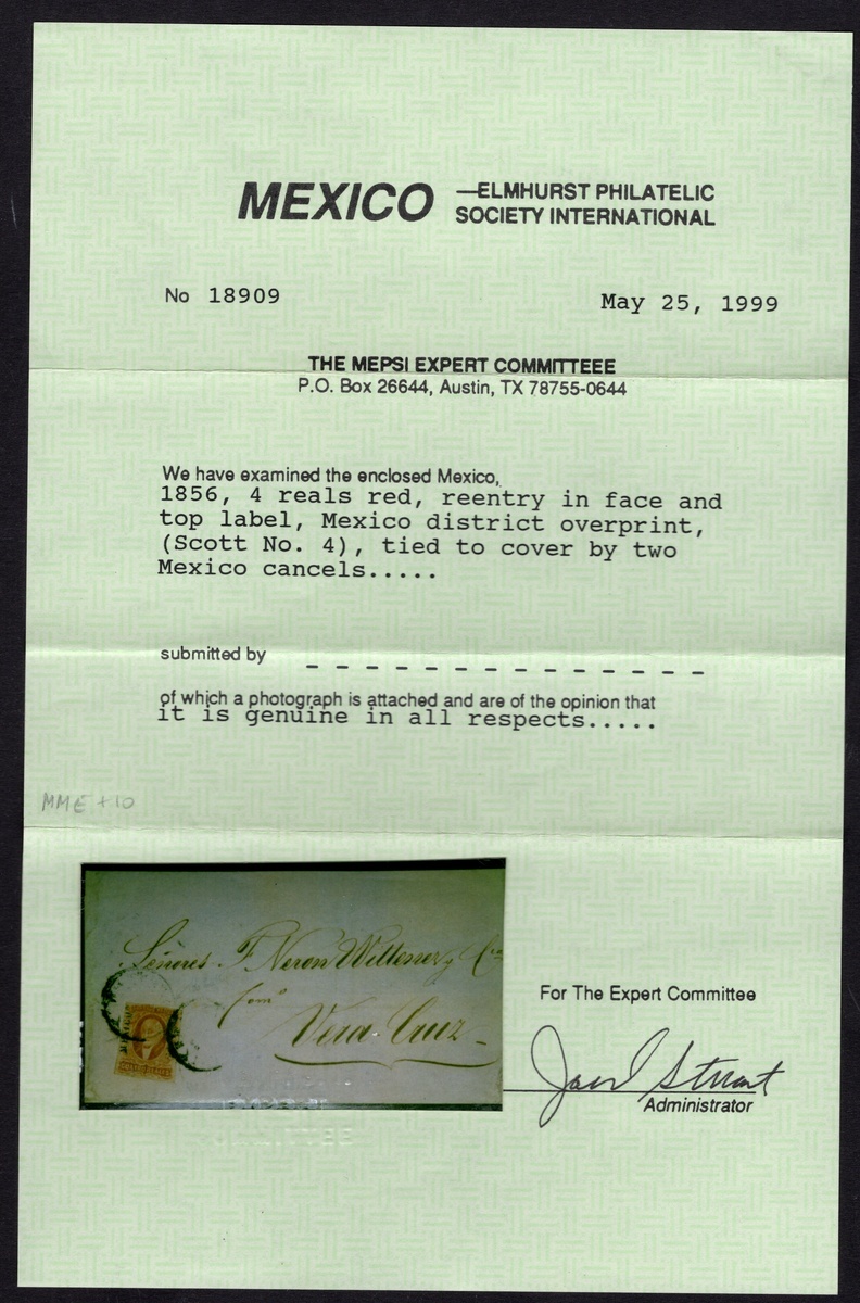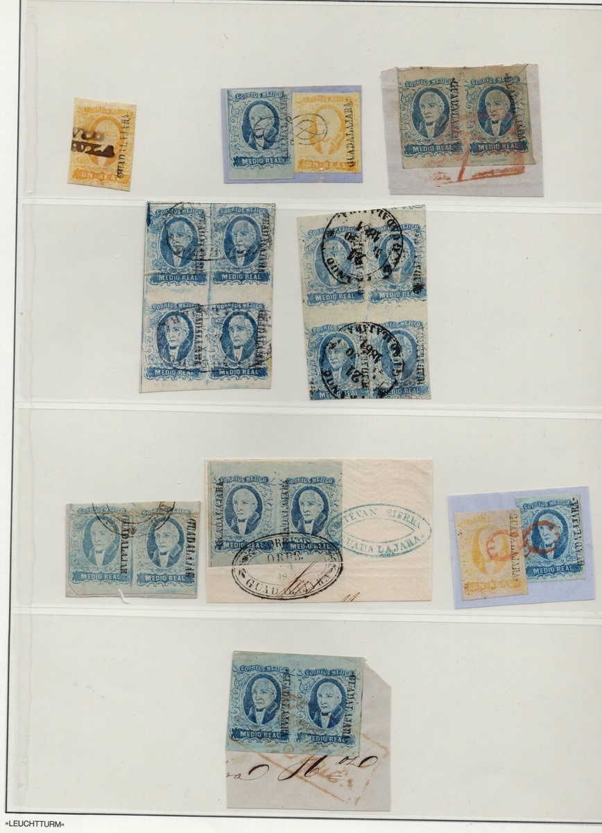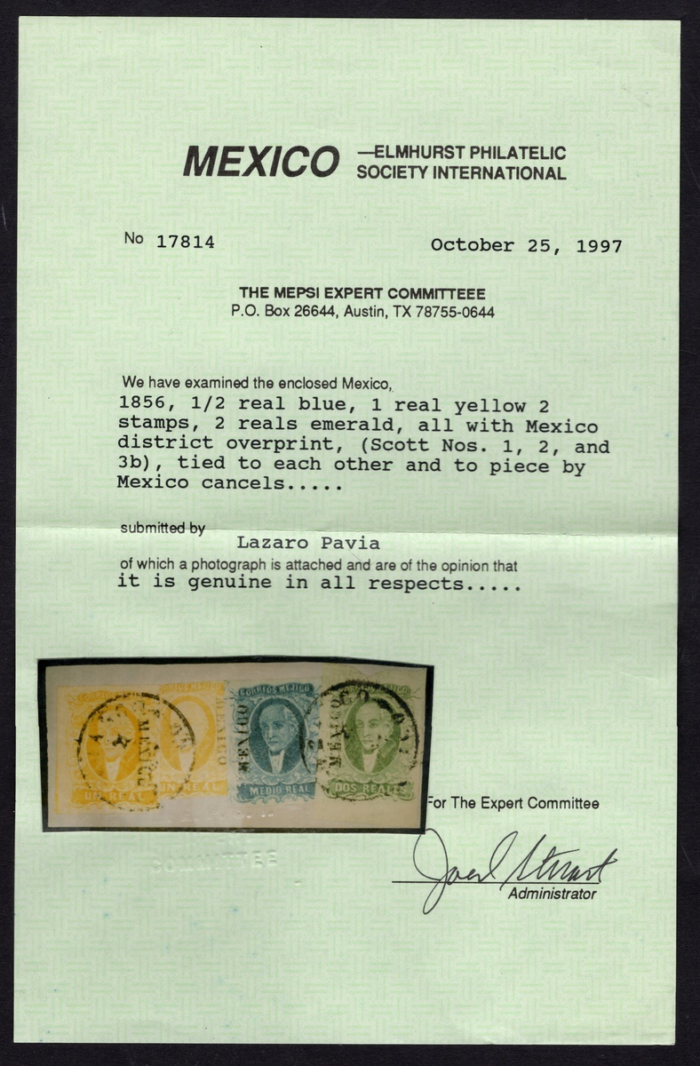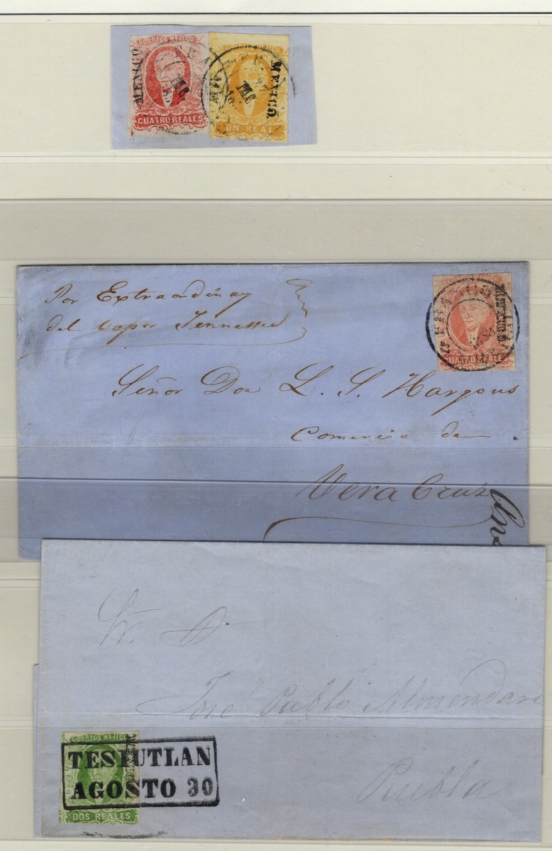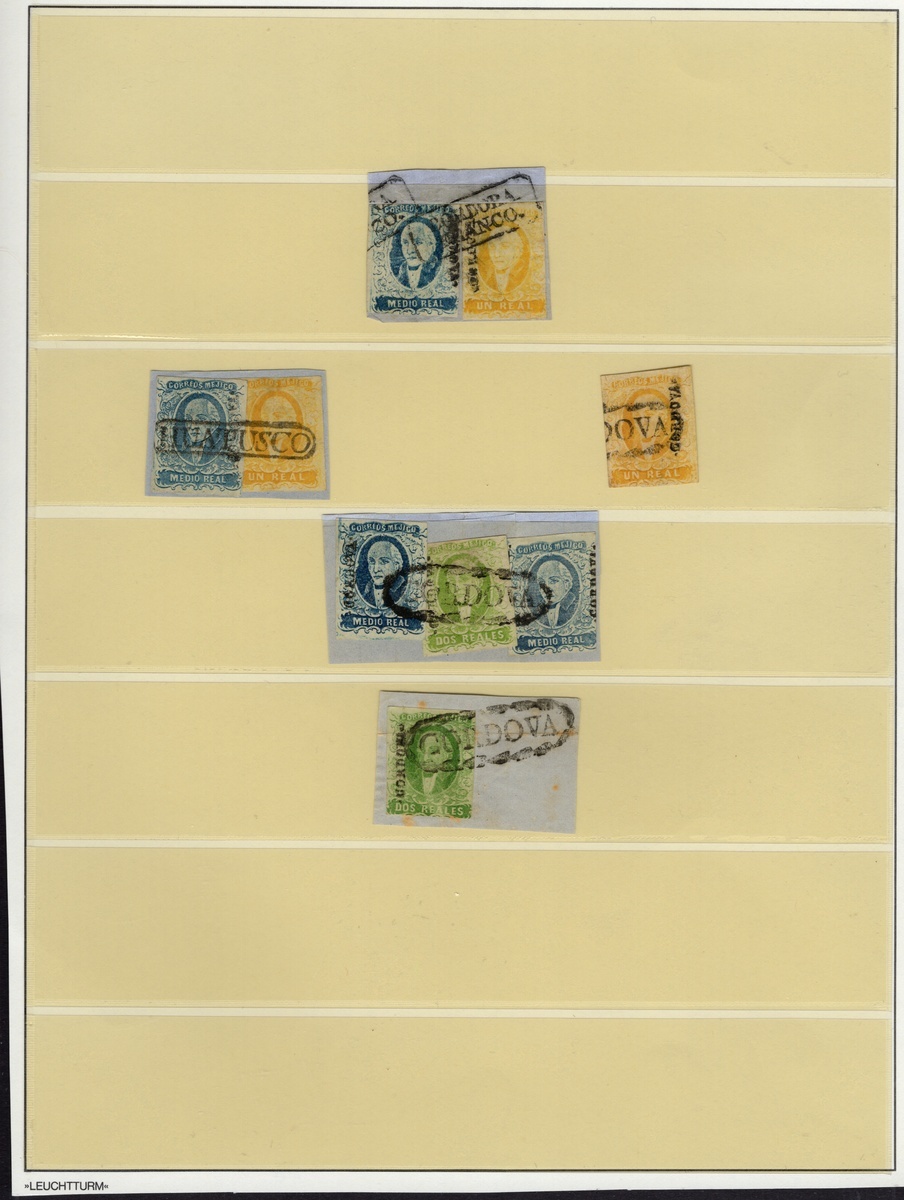 Various Districts Group of 38 stamps, several attractively presented in colorful combinations on piece, together with six appealing covers. Districts include the scarce Córdova, as well as Guadalajara and Mexico City. Highlights include two used blocks of four of the ½r. Blue, and three covers franked with the 4r. Red—one carried by Extraordinario express service, another paying the six reales rate. One cover bears a pair of 1r. Yellow with a red "Magdalena" handstamp, along with a six reales franking. A cover from San Juan de los Lagos shows a rare 1½r. rate from 1856. Also included is a striking piece bearing the 2r. Emerald (Scott #3b) alongside a ½r. Blue and two 1r. Yellow, accompanied by a 1997 MEPSI certificate. Scott 1, 2, 3, 3b, 4; NF$ 1,354 for the off cover stamps., ,