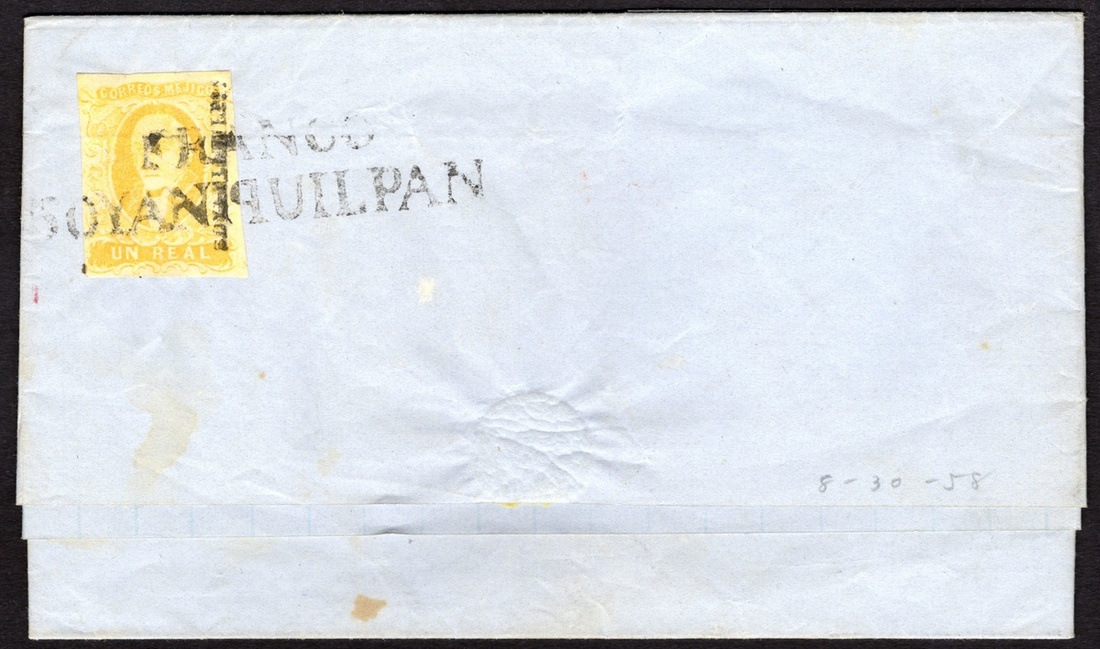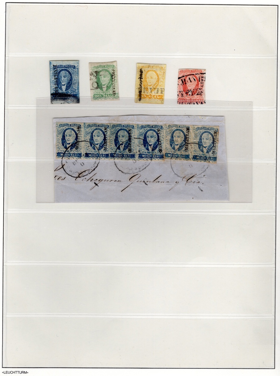 Various Districts Assembly comprising ten used stamps and one cover, all from better districts. The stamps include ½r. Blue from Tixtla Guerrero, one piece with strip of four and pair from Mazatlán, one striking 1r. Yellow Temascaltepec (Tejupilco h.s.), 2r. Emerald Tulancingo and 4r. Red Tabasco. The cover is an entire to Mexico City franked by 1r. with Soyaniquilpam h.s. dated August 30, 1858, applied on reverse. Except for the very scarce Tabasco 4r. with tight margins, all with three or four margins. Scott 1, 2, 3b, 4; NF $1,290.,