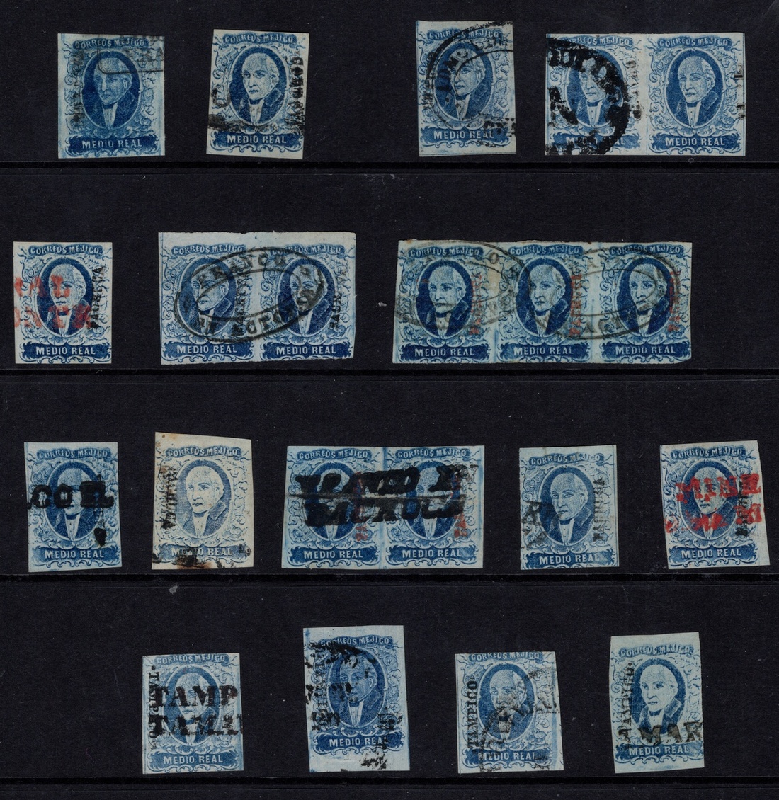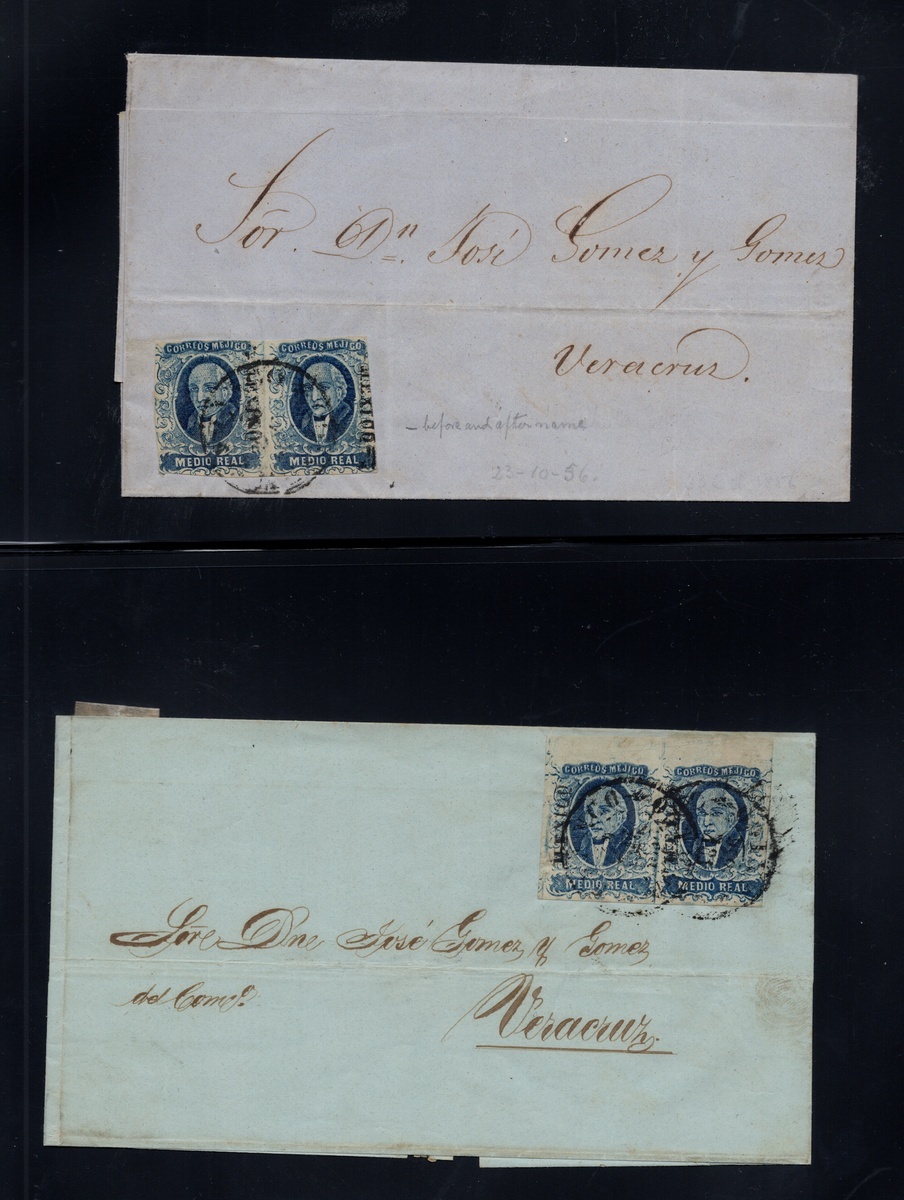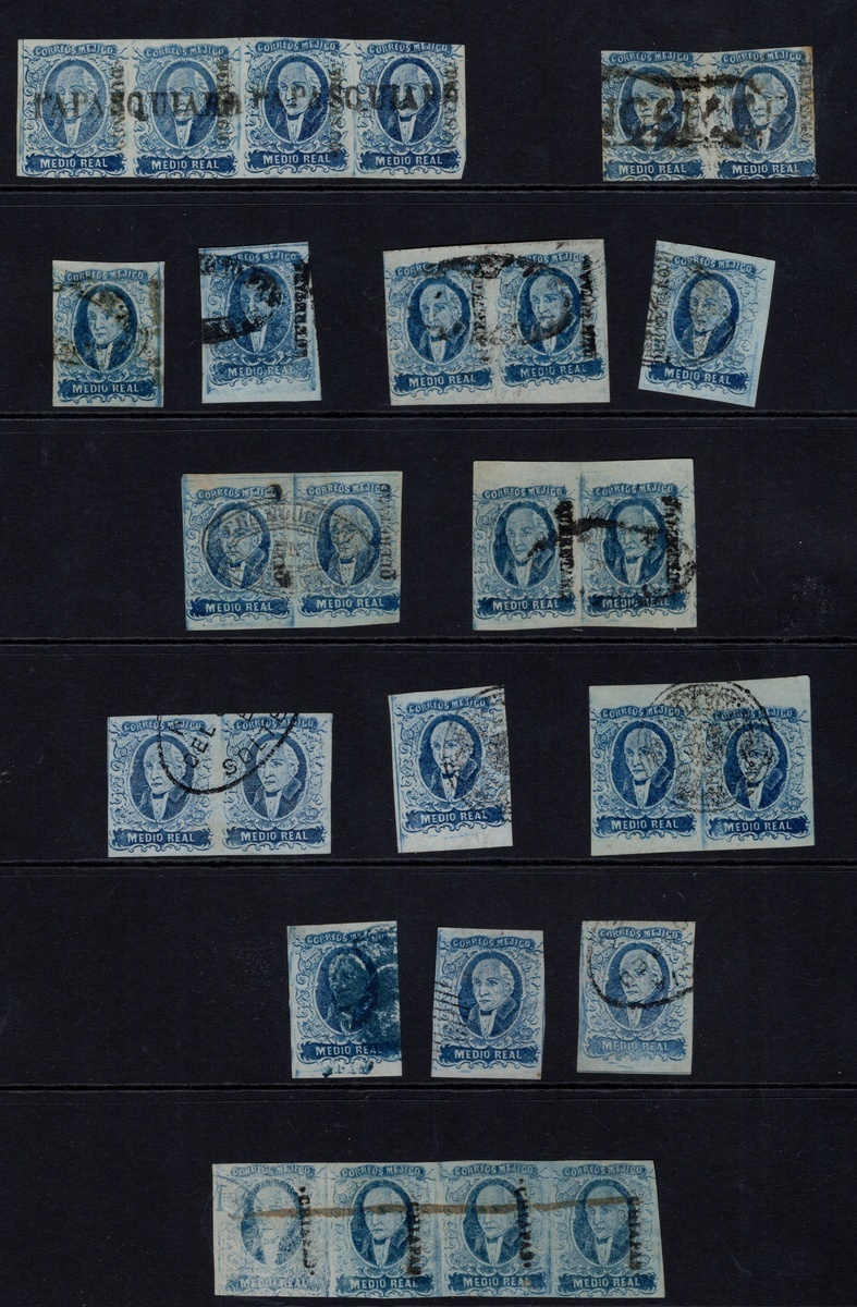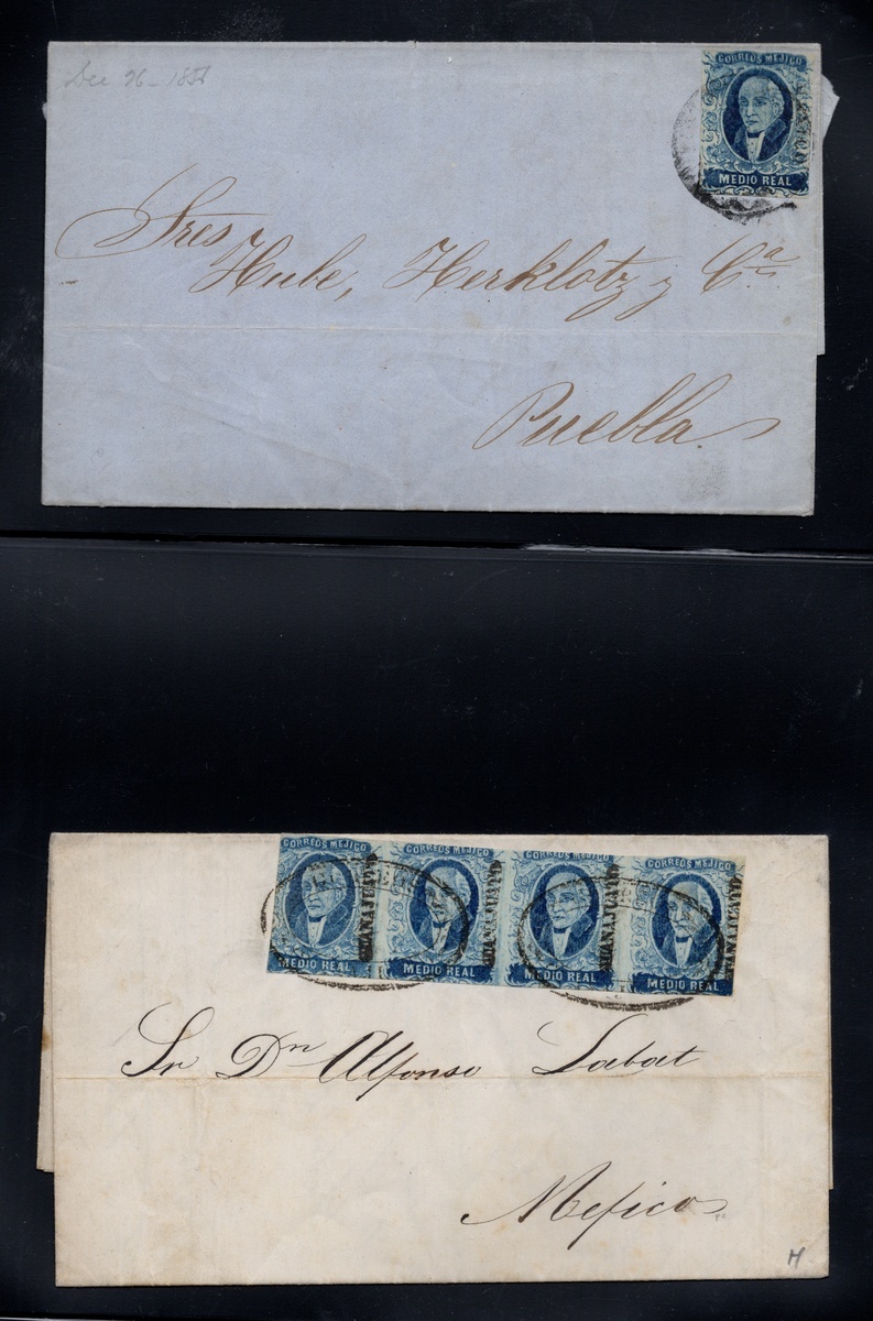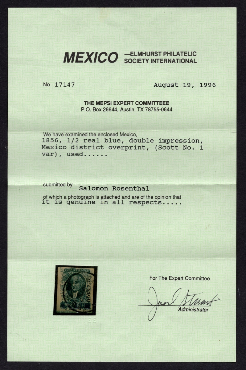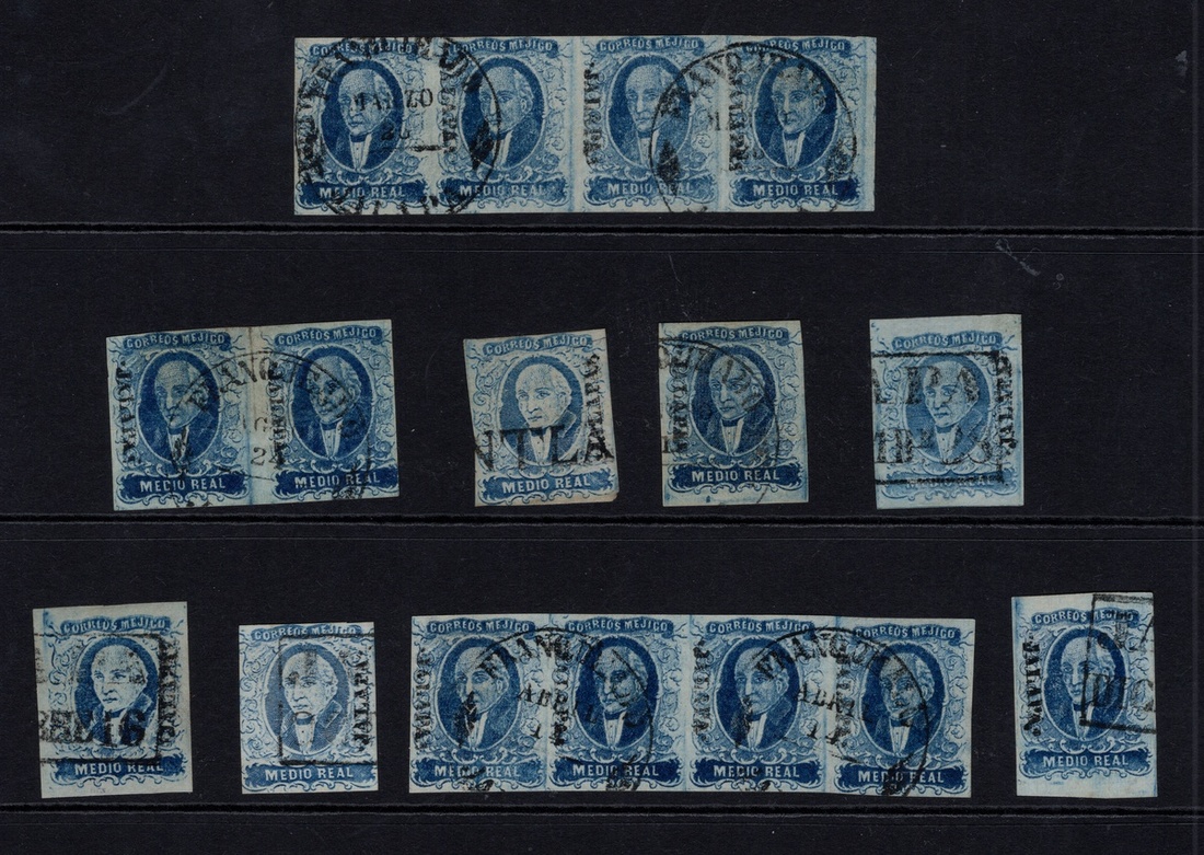 Various Districts ½r. Blue, group of ten covers, two cover fronts and 69 used stamps. Additionally, there is a very attractive "Across the Lines" cover front franked by a 2r. green, as well as a postal fraud cover bearing a reused, cancelled 2r. green. The covers are appealing, showing single usages, pairs, or strips of four from the districts of Veracruz, Querétaro, Mexico, and Guanajuato. One front features a strip of four from Durango. The stamps include a dramatic double printing with a 1996 MEPSI certificate, as well as examples from the following districts: Córdova, Chalco, Pachuca, Tampico, Jalapa (one strip accompanied by a 1995 PF certificate), Durango, Querétaro, Apam and Chiapas. Most stamps have three to four margins. Scott 1, 3; NF $2,250 for the off-cover stamps alone.,