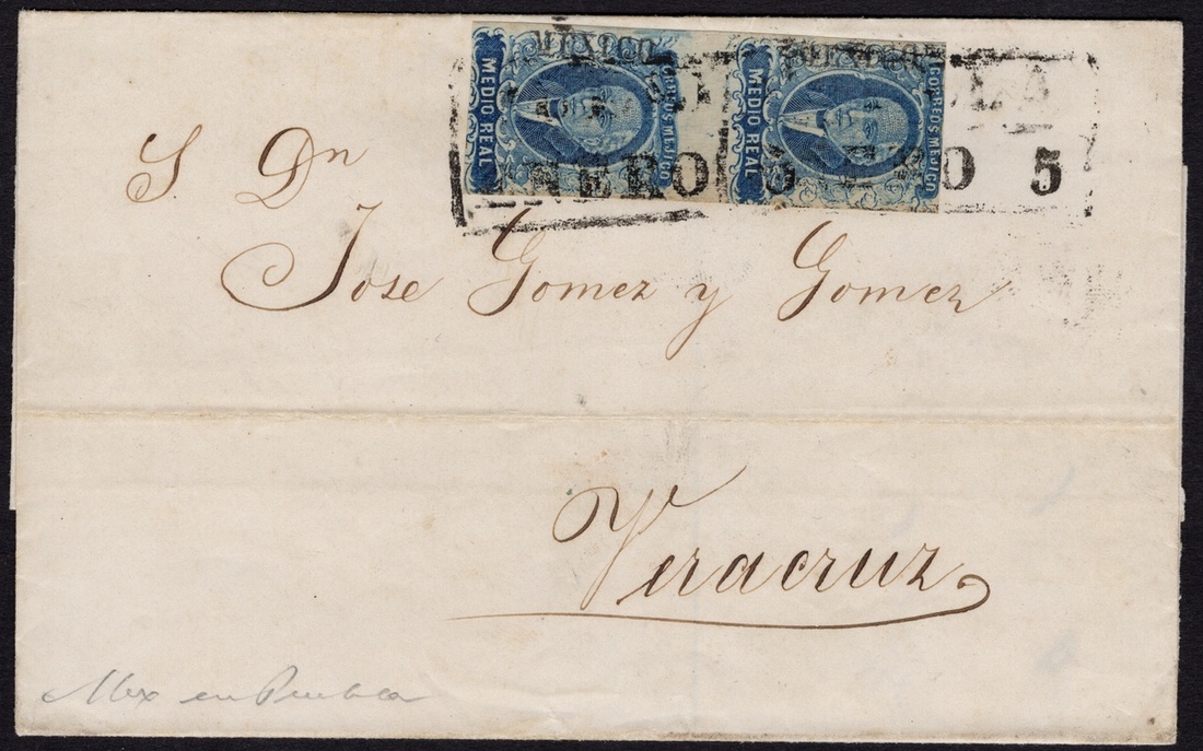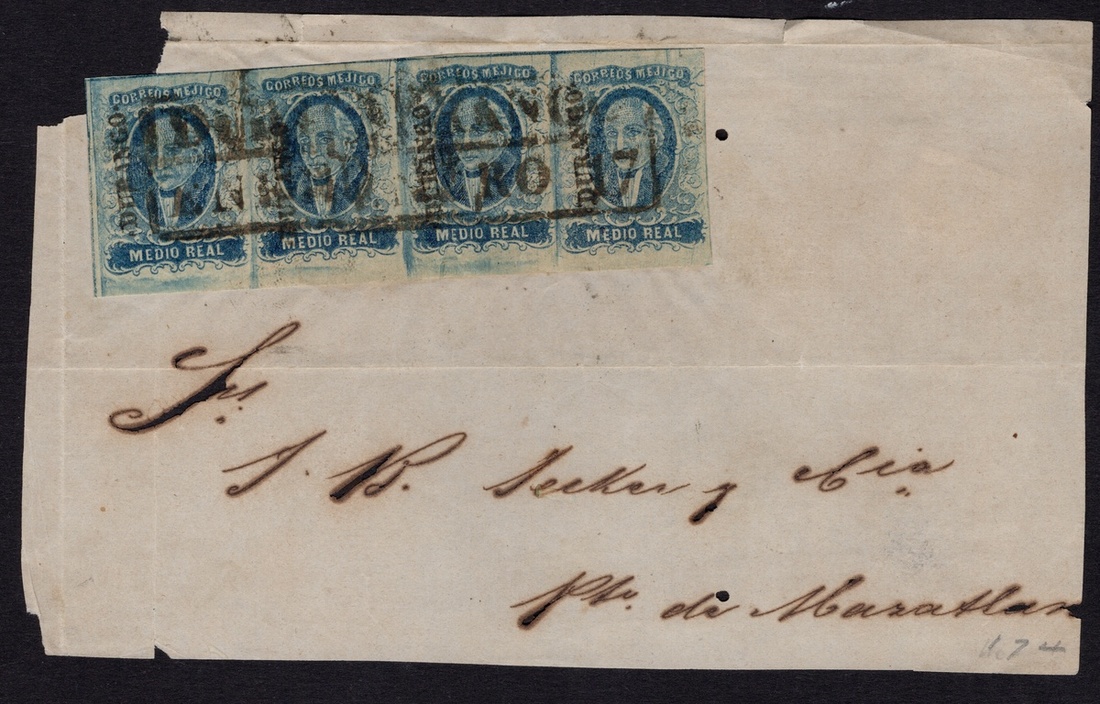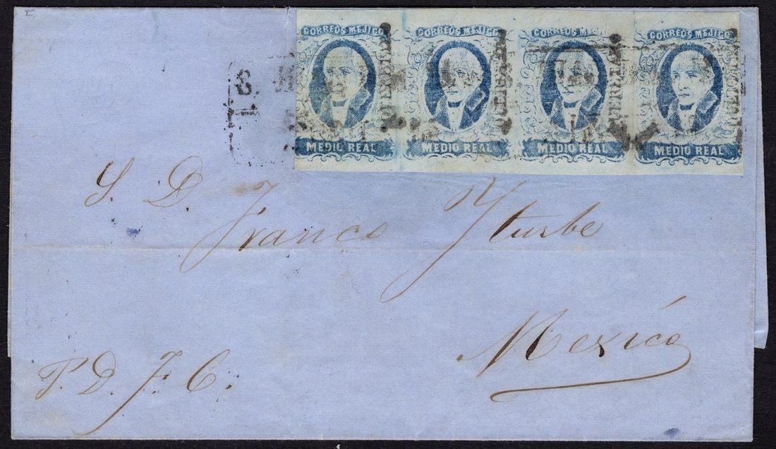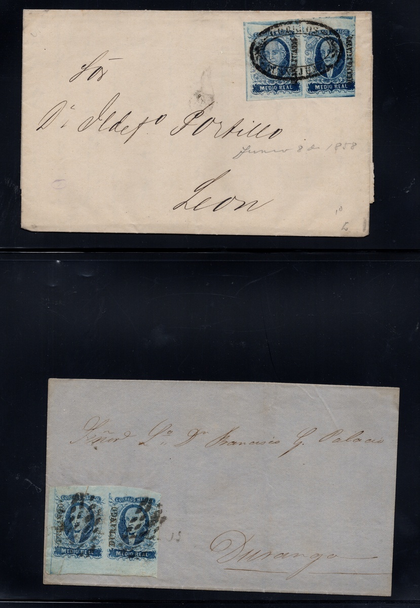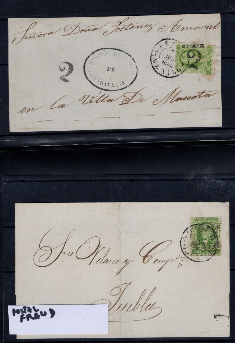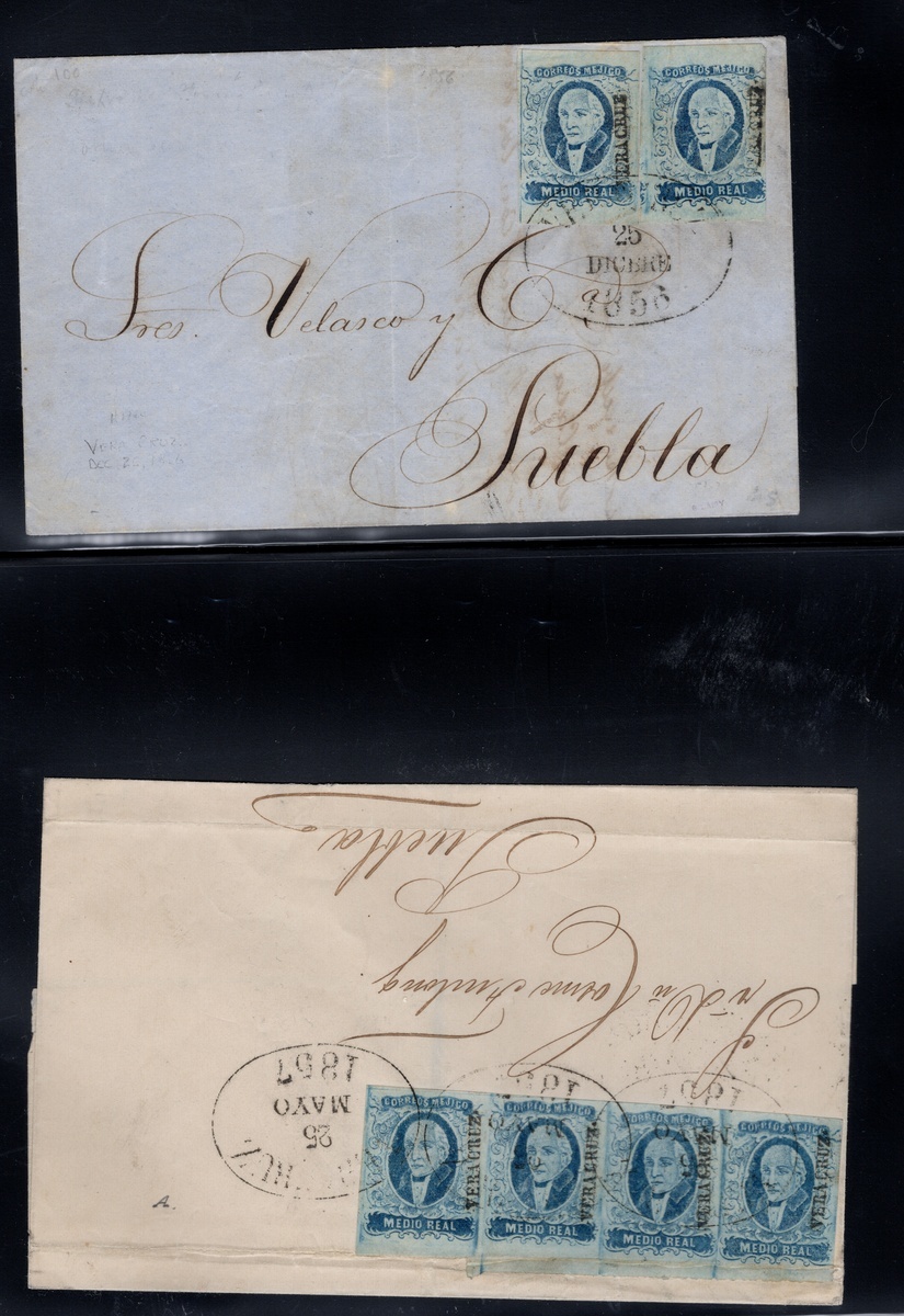 Various Districts ½r. Blue, group of ten covers, two cover fronts and 69 used stamps. Additionally, there is a very attractive "Across the Lines" cover front franked by a 2r. green, as well as a postal fraud cover bearing a reused, cancelled 2r. green. The covers are appealing, showing single usages, pairs, or strips of four from the districts of Veracruz, Querétaro, Mexico, and Guanajuato. One front features a strip of four from Durango. The stamps include a dramatic double printing with a 1996 MEPSI certificate, as well as examples from the following districts: Córdova, Chalco, Pachuca, Tampico, Jalapa (one strip accompanied by a 1995 PF certificate), Durango, Querétaro, Apam and Chiapas. Most stamps have three to four margins. Scott 1, 3; NF $2,250 for the off-cover stamps alone.,