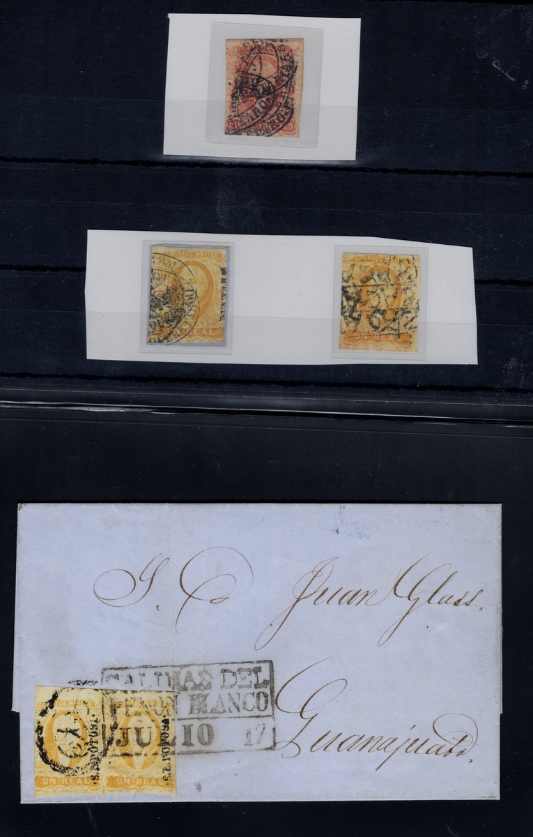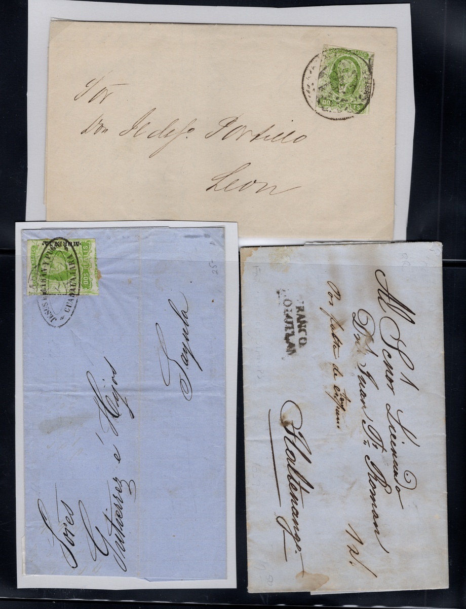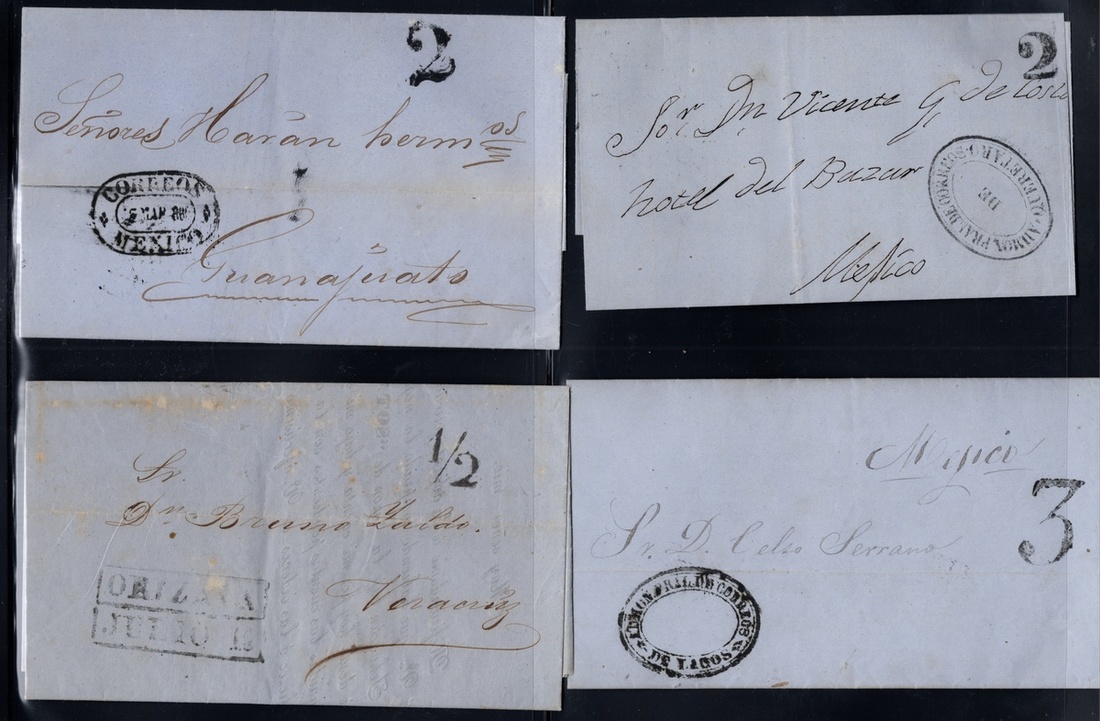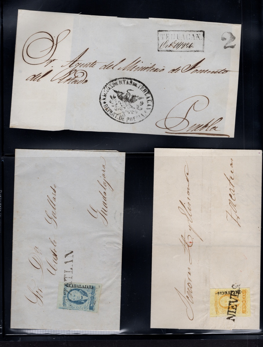 Various Districts Group of five franked covers, six stampless covers, and three singles off cover, mostly in good condition. The covers bearing stamps originate from San Luis Potosí, Morelia, Mexico, Guadalajara, and Zacatecas. The stampless covers are from Mexico, Orizava, Puebla, Querétaro, Lagos, and Colotlán, and may represent postal dues to be collected from the addressee. Scott 2, 3, 4.