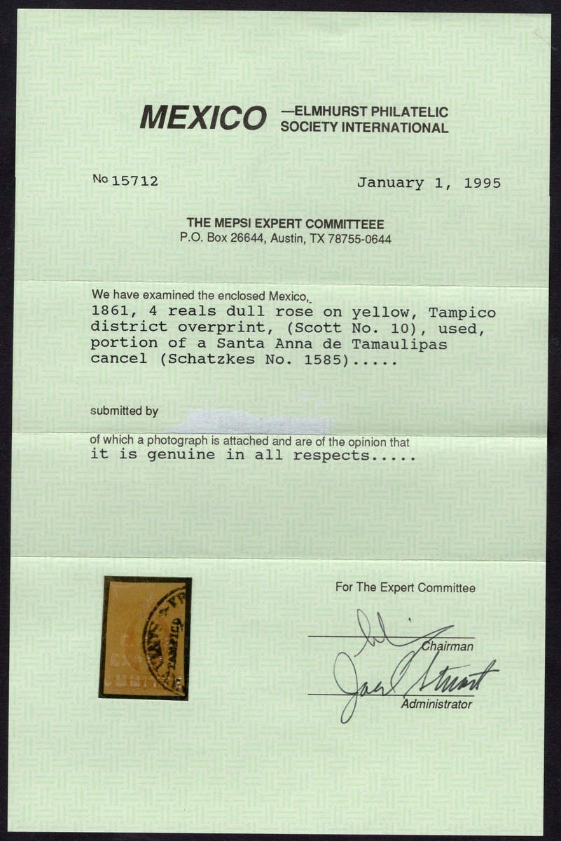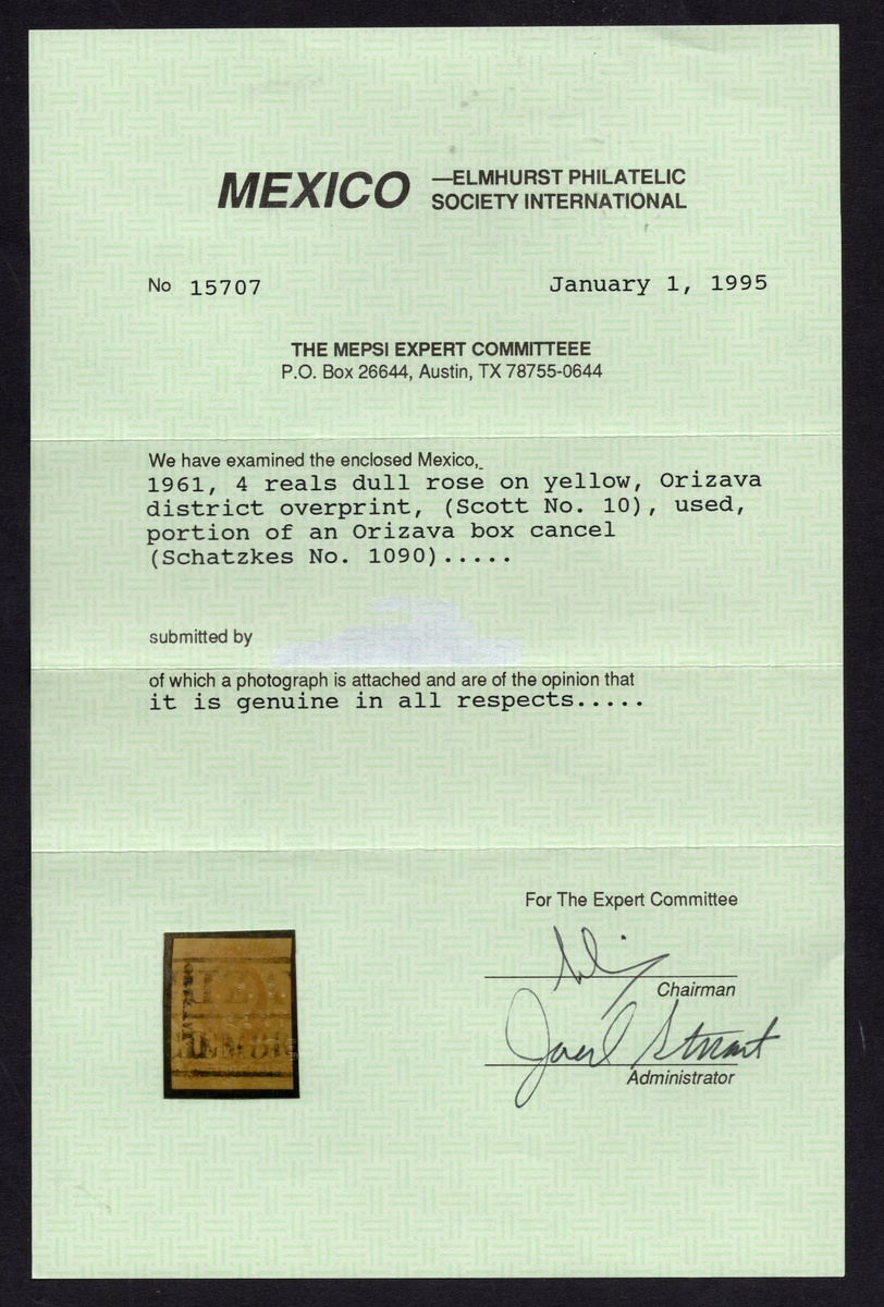 Orizava, Tampico 4r. Rose on Yellow, duo of very scarce used stamps: the Orizava example with three good margins, close at right, with a clear date cancellation, and the Tampico example well margined, used with a bold circular date stamp. Very rare, with only 289 and 356 issued, respectively. 1995 MEPSI certificates for both. Scott 10; NF $ 650.