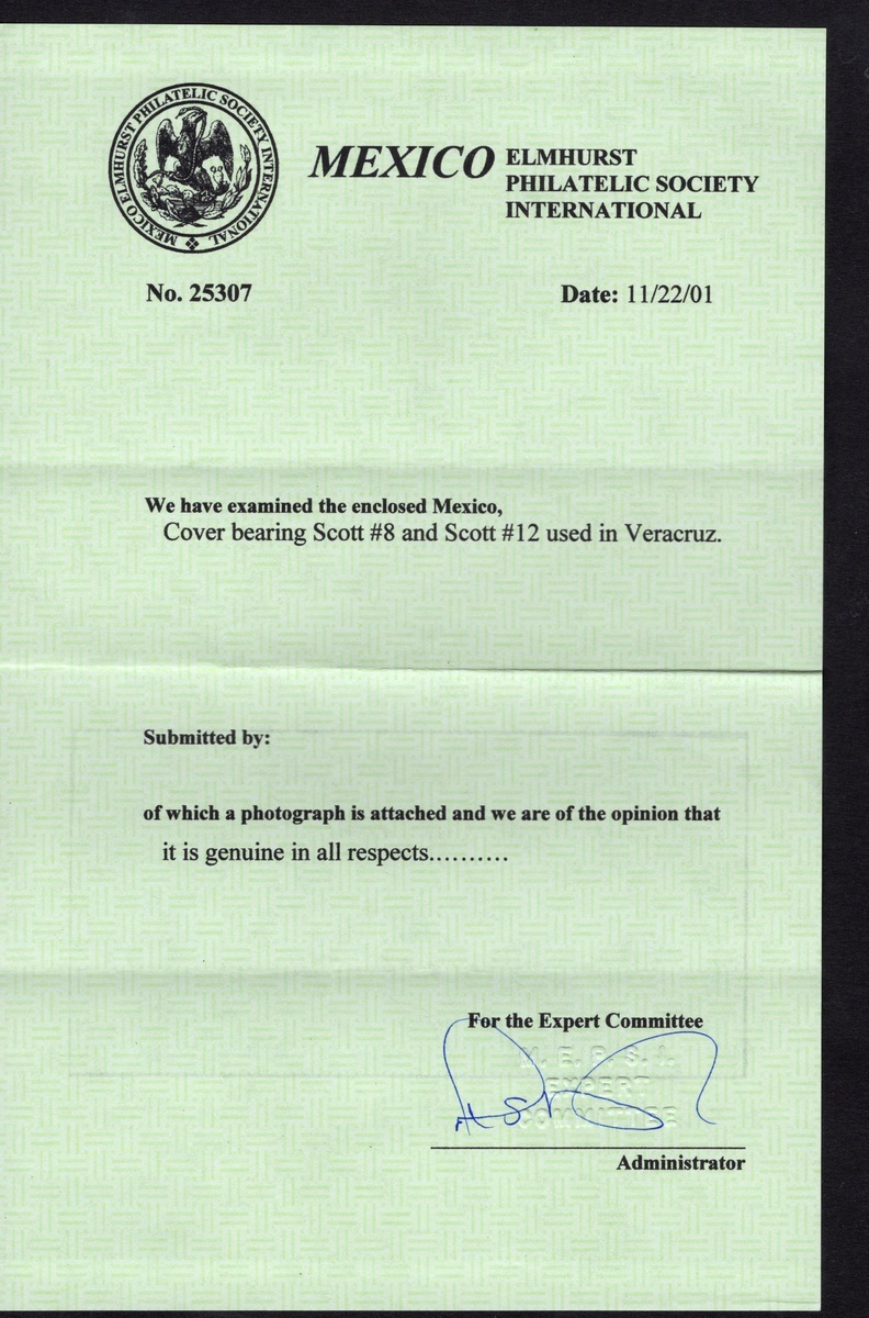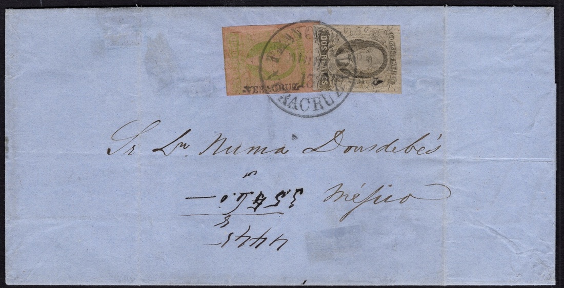 Veracruz 8r. Green on Brown, a fine example with large margins, in combination with 2r. Rose on Black, just touching into one place, both used on April 11,1864 entire letter to Mexico City. A very desirable exhibition item as no more than twenty covers are recorded with this stamp. 2001 MEPSI certificate. Scott 12, 8. $1,000 as single on cover.