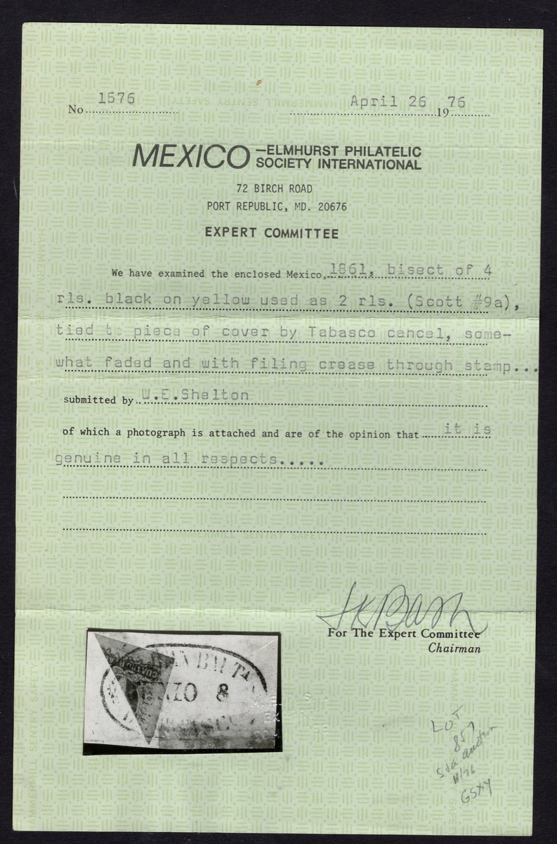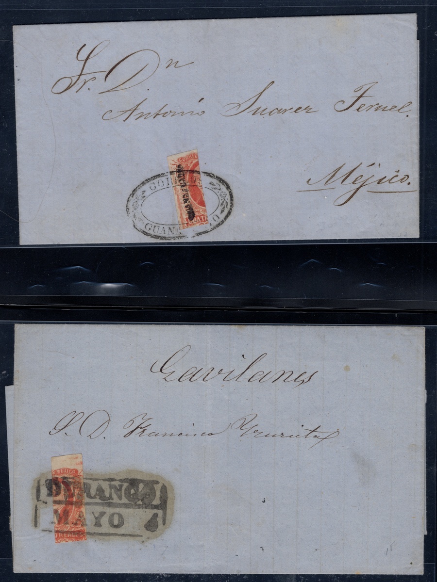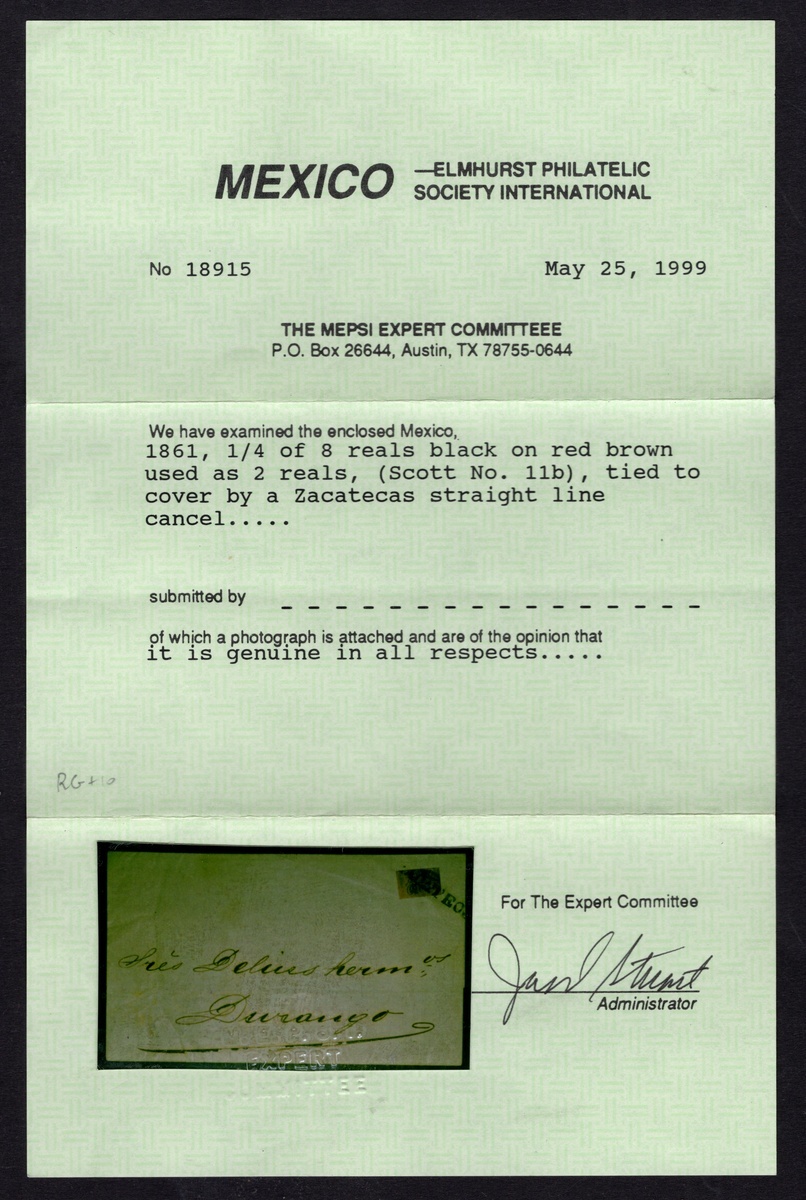Various Districts Group of 19 splits, represented on nine very attractive covers and entire letters, as well ten on piece, featuring an attractive variety of cuts. All but one of the covers are from the 1856 issue, including seven bisects of the 4r. Red (Guanajuato, Zacatecas, Durango y Morelia) and one 8r. Lilac quadrisect (Morelia), as well as 1861 quadrisect of 8r. black on Brown from Zacatecas. The splits on pieces are all but one from 1856: three 4r. Red bisects and six 8r. Lilac quadrisects; the highlight being a rare combination of 4r. Red bisect and two ½r. Blue. The 1861 issue is represented on piece with a rare triangular bisect of 4r. Black on Yellow from Tabasco. Three Mepsi certificates (1976, 1978, 1979). It includes items originating from the Strauss, John Bash, Hendricks, Franz-Josef Strieker and Will Shelton collections. Scott 4a, 5d, 9a; NF $2,315,