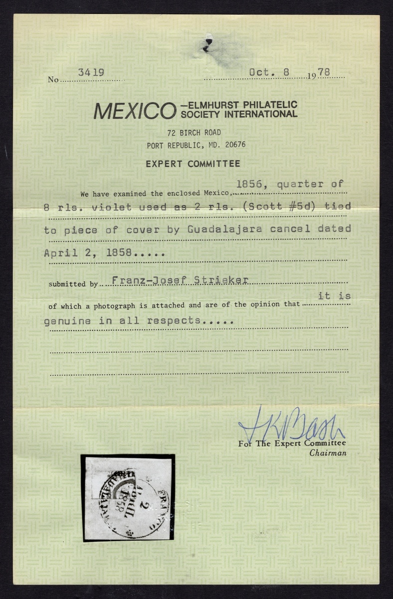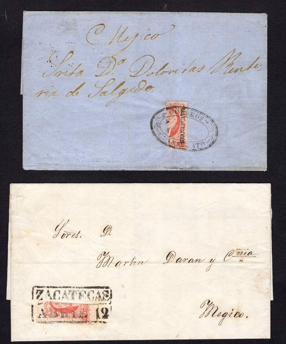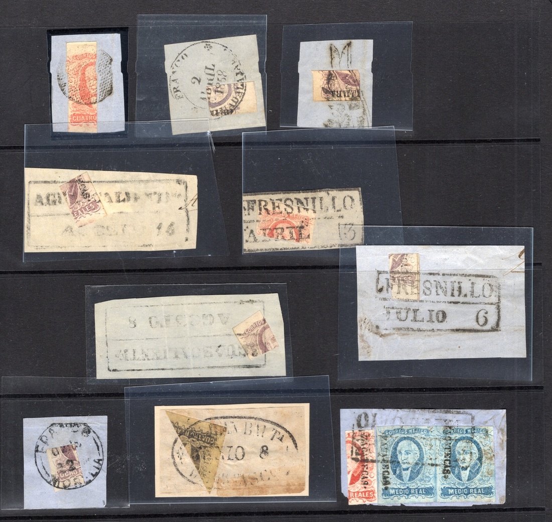 Various Districts Group of 19 splits, represented on nine very attractive covers and entire letters, as well ten on piece, featuring an attractive variety of cuts. All but one of the covers are from the 1856 issue, including seven bisects of the 4r. Red (Guanajuato, Zacatecas, Durango y Morelia) and one 8r. Lilac quadrisect (Morelia), as well as 1861 quadrisect of 8r. black on Brown from Zacatecas. The splits on pieces are all but one from 1856: three 4r. Red bisects and six 8r. Lilac quadrisects; the highlight being a rare combination of 4r. Red bisect and two ½r. Blue. The 1861 issue is represented on piece with a rare triangular bisect of 4r. Black on Yellow from Tabasco. Three Mepsi certificates (1976, 1978, 1979). It includes items originating from the Strauss, John Bash, Hendricks, Franz-Josef Strieker and Will Shelton collections. Scott 4a, 5d, 9a; NF $2,315,