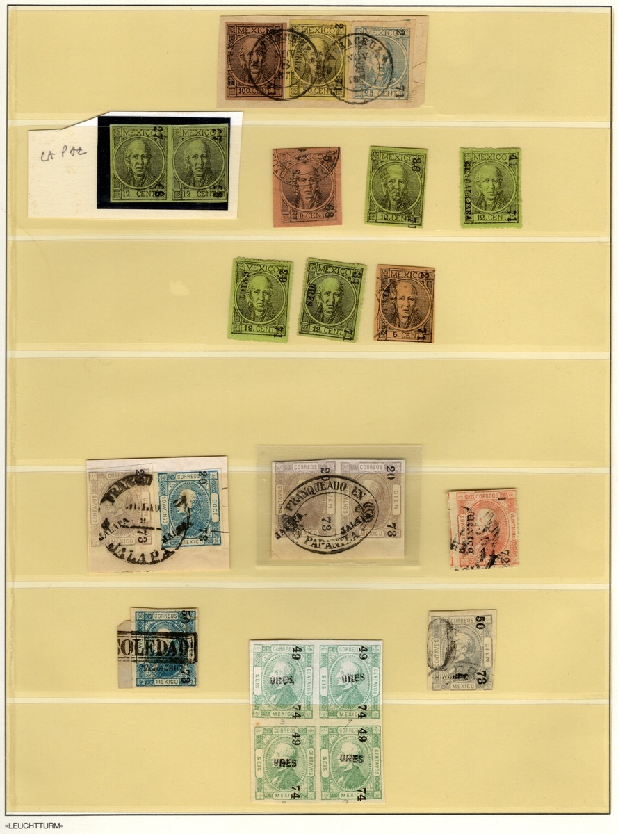Various Districts Group of 40 stamps from 1861, 1867, 1868 and 1872 Hidalgo Issues, with highlights being #8 with "Aguascaltes" overprint, #10b 4r. Red unoveprinted in unused condition, 1868 tri-color franking on piece, #38a Gothic printed on both sides, as well as 1872 100c. with used pair and Ures unused block of four. Scott $1,007+., ,