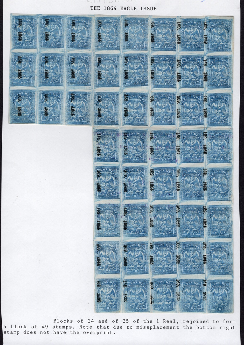Chihuahua 1r. Blue (#169-1865), 4th Period, two large blocks of 24 and 25 stamps, rejoined to form a very large multiple of 49 units with original gum, with nearly all stamps n.h. Just one thin spot in one of the multiples. A spectacular exhibition item. Scott 21, $735 as hinged singles., ,