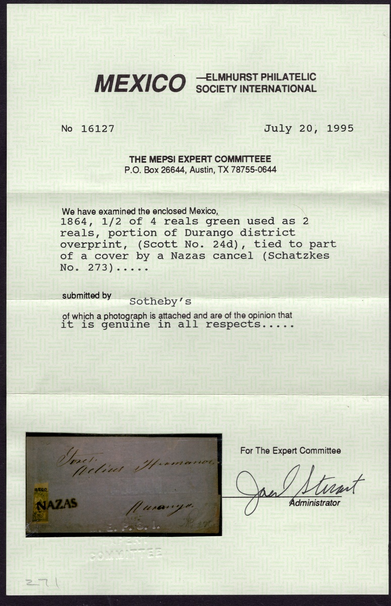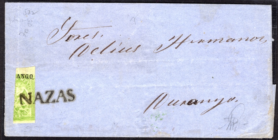 Durango 4r. Green, bisect on cover front, cancelled in the small town of Nazas with handstamp tying the franking, dated July 13, 1865. 1995 MEPSI certificate and signed J.K. Bash. Scott 24d, $700 on cover.