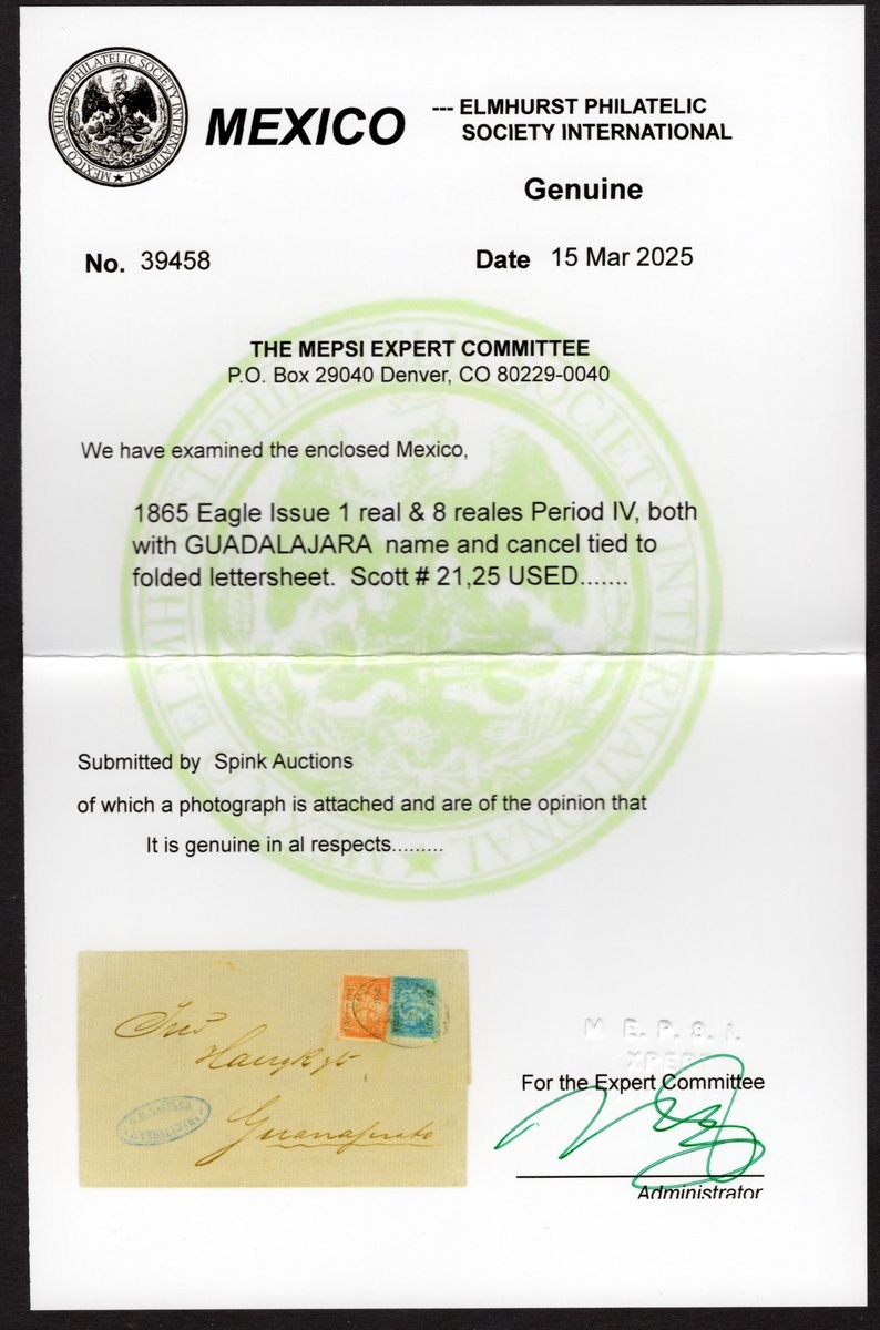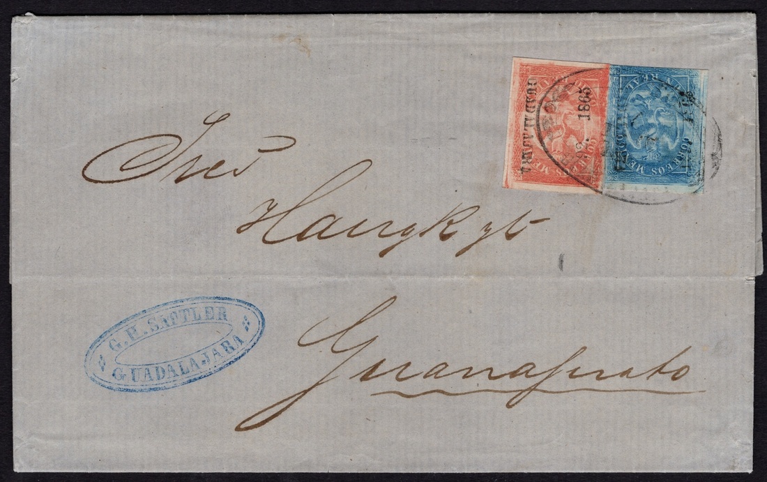 Guadalajara 1r. Blue (#155-65) and 8r. Red (#92-65) 4th period, on attractive entire letter to Guanajuato dated December 5, 1865, cancelled with oval h.s. Filing crease not affecting the stamps. Any 8r. on cover is scarce. 2025 MEPSI certificate. Scott 21, 25.