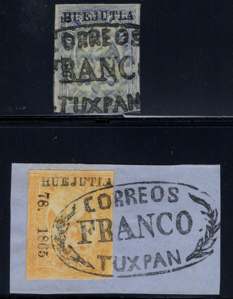 Huejutla Two very attractive stamps with well-struck Tuxpan cancels, including 1r. blue, 3rd Period (#216-1864), with three good margins and one just touched (only 200 issued), and 2r. yellow, 4th Period (#78-1865), on piece, with margins all around. Scott 21a, 23; NF $340.