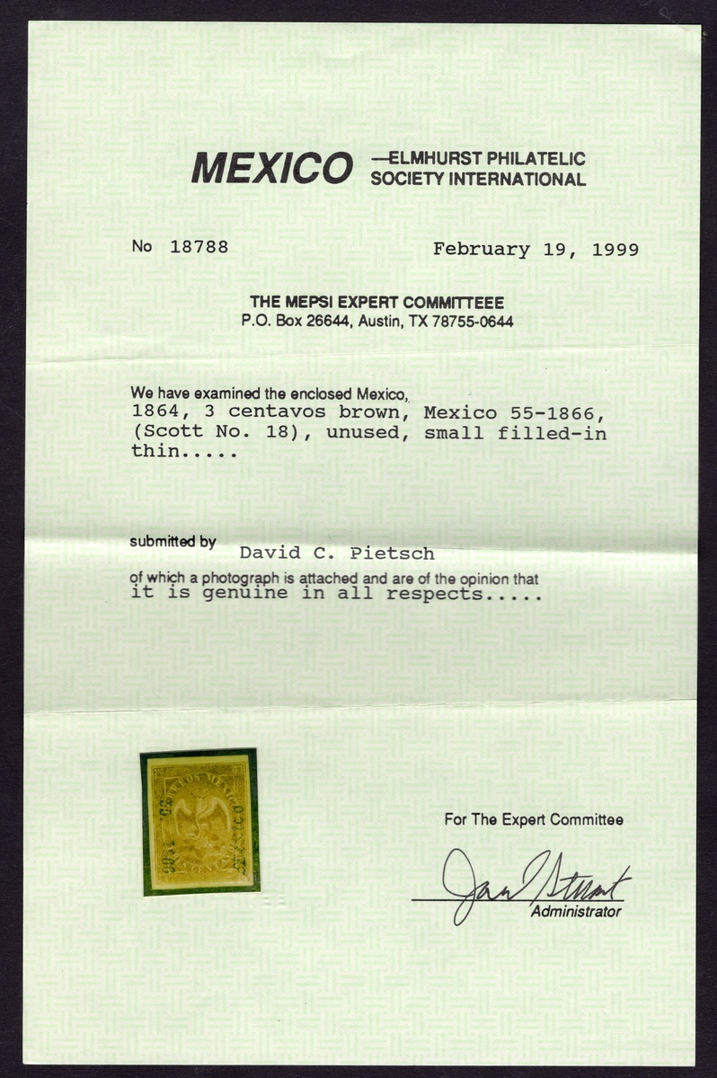 Mexico District 3c. Brown (#55-1866), fifth period, an unused example with large margins all around and fresh color. Small filled-in thin, nevertheless a great looking stamp. Issued as an experiment for local city mail between 1866 and 1867, only 2,403 of these stamps were printed, including 300 from this consignment. 1999 MEPSI certificate. Scott 18, $1,300.