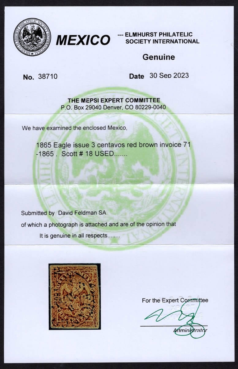 Mexico District 3c. Brown, 4th Period, consignment 71-1865, narrow margins and cutting into, used with c.d.s. A total of 2,403 stamps were printed for the Mexico City local mail experiment, with only 200 originating from this consignment. Cancelled examples of this denomination are exceptionally scarce, as most letters posted in the designated city mailboxes were left uncancelled; only those handed in directly at the post office received a cancellation. A good example and an essential piece of classic Mexico, being one of the likely fifteen known examples from any consignment that received an actual cancelation. 2023 MEPSI certificate. Scott 18, $3,250.