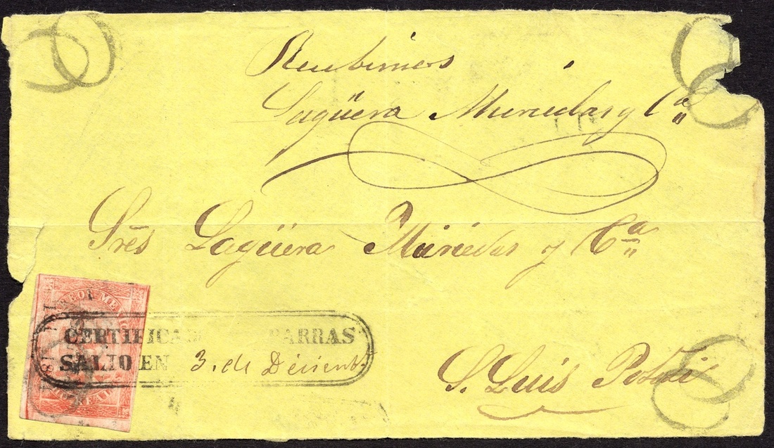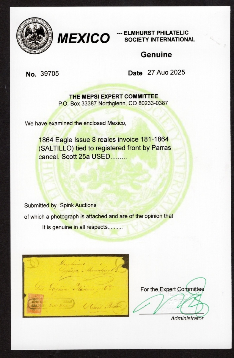 Saltillo 8r. Red (#181-1864), 3rd Period, complete to mainly ample margins, tied to Dec. 3, 1864 registered front from Parras to San Luis Potosí. At most ten registered items are recorded in this issue. Registered mail is very scarce, as postal regulations required the front of the cover to be cut out and signed by the addressee as proof of delivery, then returned to the office of dispatch, where it was to be kept for two years before being destroyed. 2025 MEPSI certificate. Scott 25a.