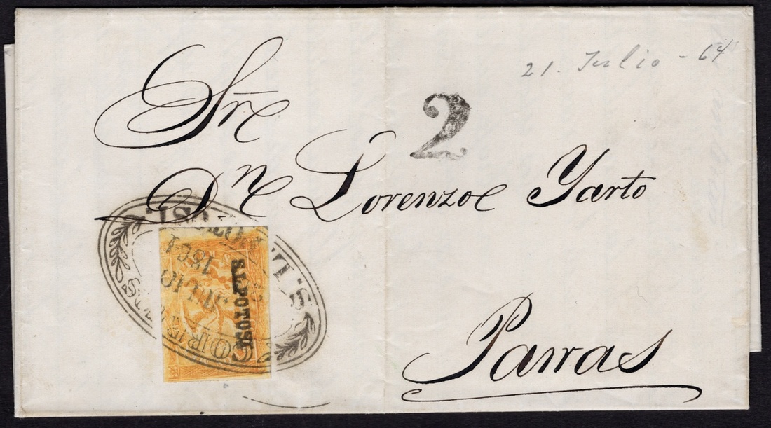 San Luis Potosí 2r. yellow, 1st Period, tied to an attractive entire letter dated July 21, 1864, from San Luis Potosí to Parras. Across-the-lines usage, as Parras at that time was under Juárez’s army control and the stamp was not recognized as valid. A "sello negro" marking "2" indicates that the addressee had to pay postage due. Scott 23b.