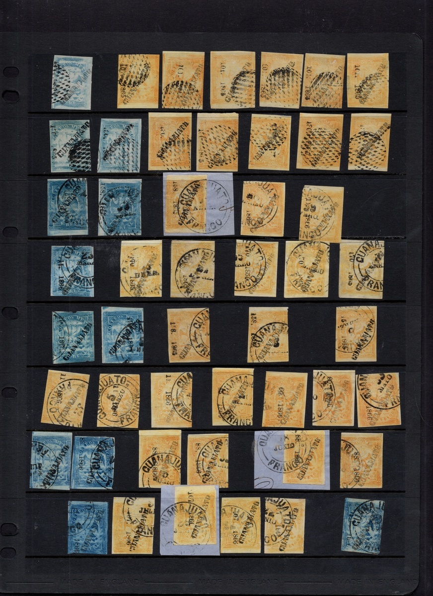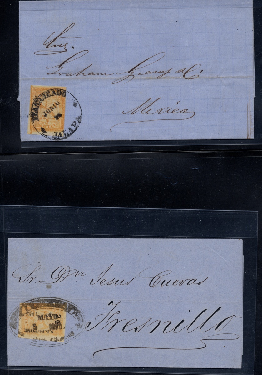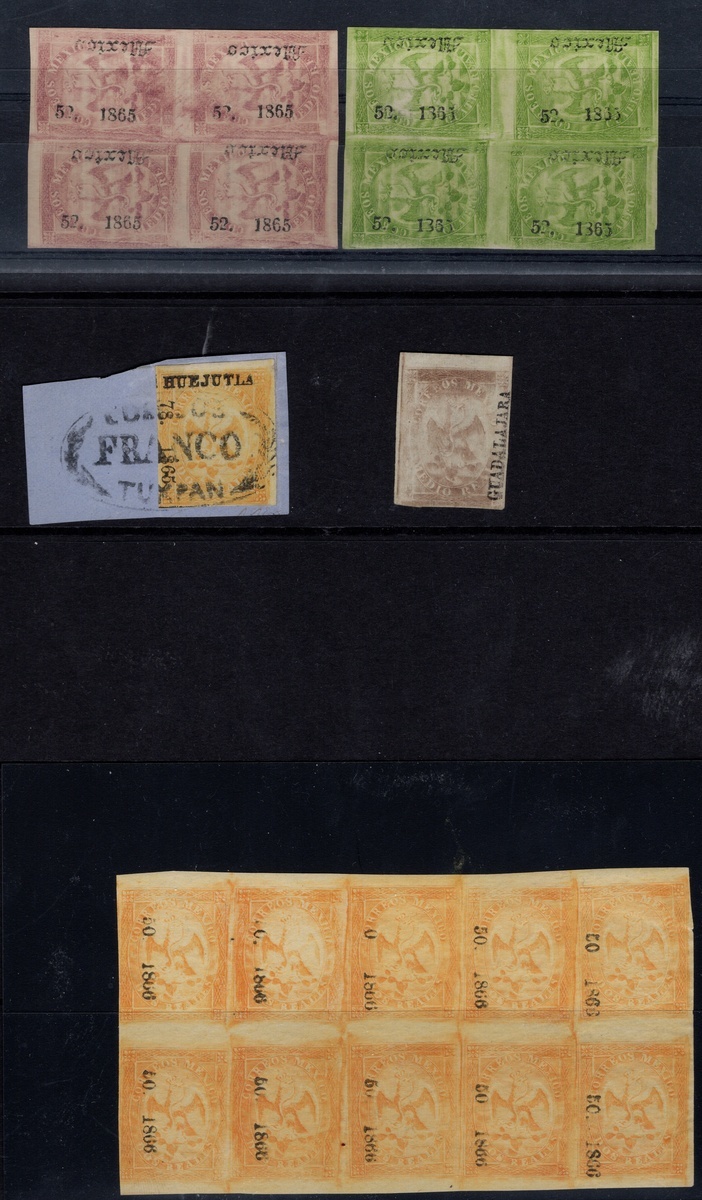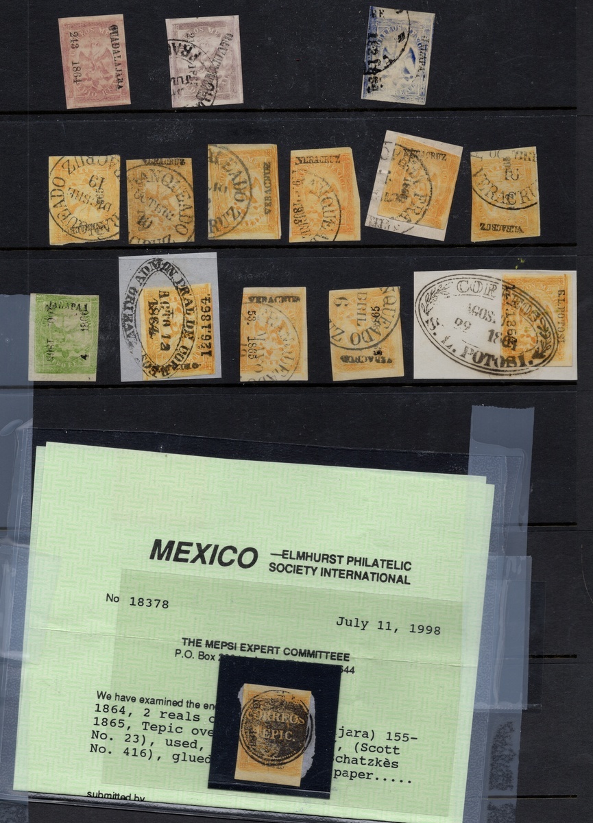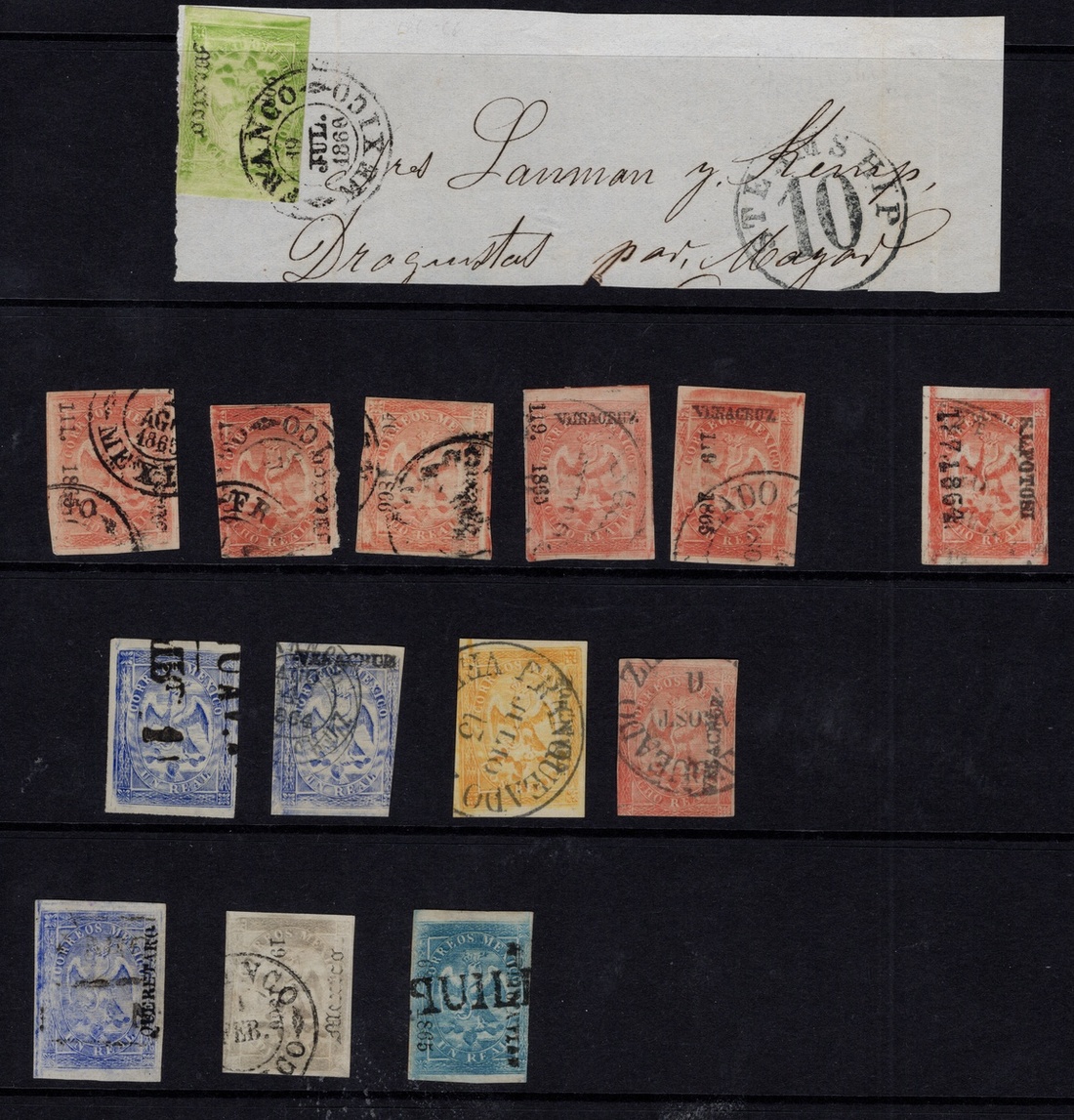 Various Districts Assembly comprising 136 stamps used and unused, eleven covers and two cover fronts, with all five Periods represented. Some of the many highlights include: an appealing ½r. Brown 1st Period unused (tight margins, but very scarce, Scott $400), 2r. Huejutla with Tuxpan h.s. on piece, fresh 1r. Soyaniquilpam 4th Period and seven 8r. displaying deep shades. Districts include Huejutla, Mexico, Guadalajara, Chihuahua, Aguascalientes, Guanajuato, Jalapa, San Luis Potosí, Soyaniquilpam, Veracruz and Orizava. Multiples include three unused blocks, including two eye-catching blocks of four: Mexico ½r. Lilac and 4r. Green (both #52-1865). The covers are in good condition and exhibit appealing cancels from Lagos, Perote, Jalapa, Aguascalientes and San Luis. One superb cover has a 4r. with three margins and a perfect cancel from Veracruz. One 1998 MEPSI certificate. Scott 19-25; NF $ 2,700 as singles off cover., , ,